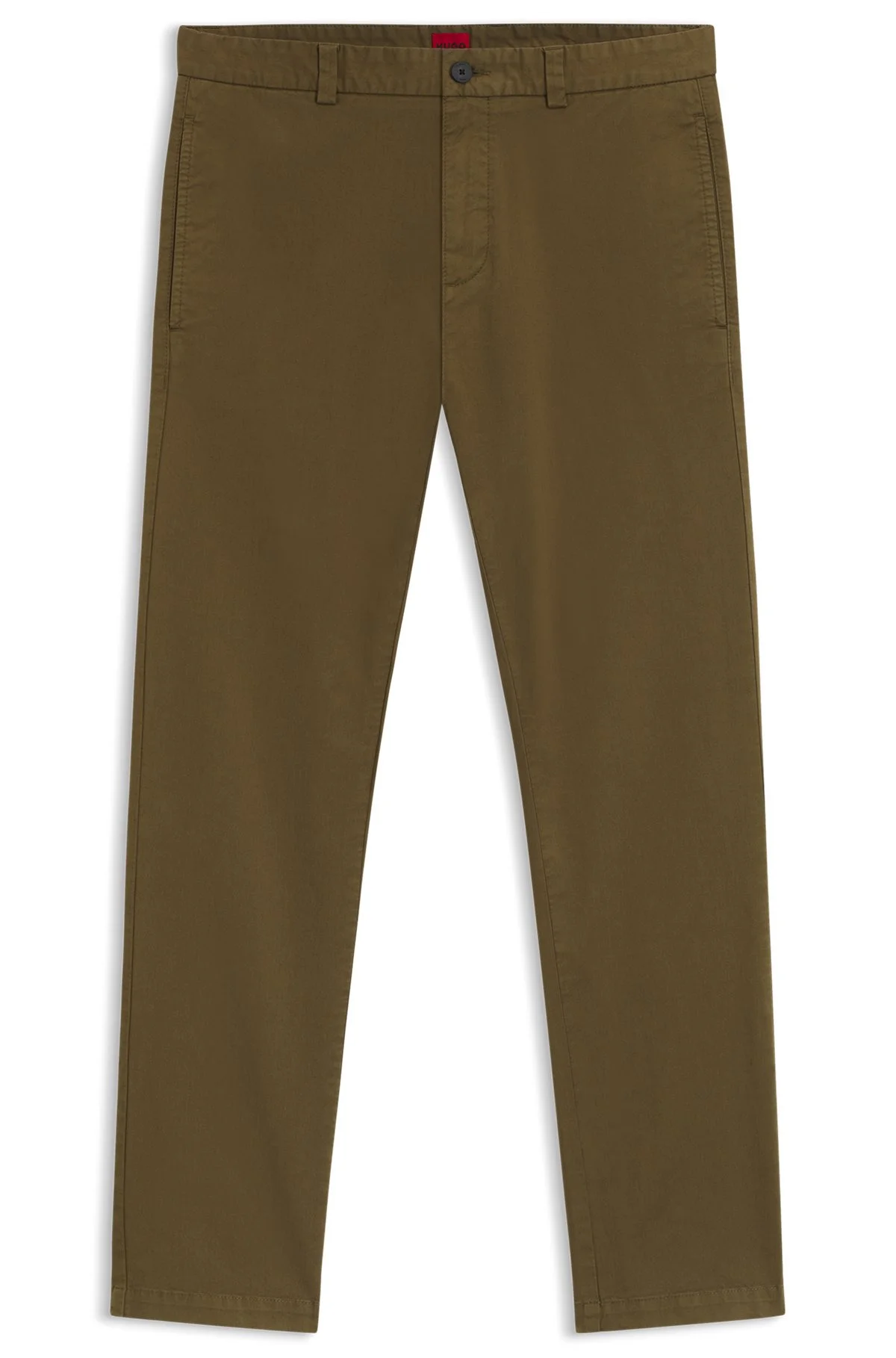SIZE AND FIT The model wears a size 32/32 and is 6'2" tall with a, 35" chest, 27" waist and 35" hips. DETAILS David251D - 50530886 Adaptable trousers by HUGO Menswear, cut to a defined fit. This pair is crafted in rich gabardine with stretch. Red logo label. Belt loops. Slim fit Regular rise Button and zip closure Slim leg Pockets bottom front: Side slash pockets Pockets bottom back: Welt pocket Fit foot width: 35,0 cm (13.8 inches) QUALITY & CARE INSTRUCTIONS Do Not Bleach Iron Low Heat Quality: 98% Cotton, 2% Elastane, pocketing: 100% Cotton Reduced Dry Clean Machine Wash Cold Gentle Do Not Tumble Dry