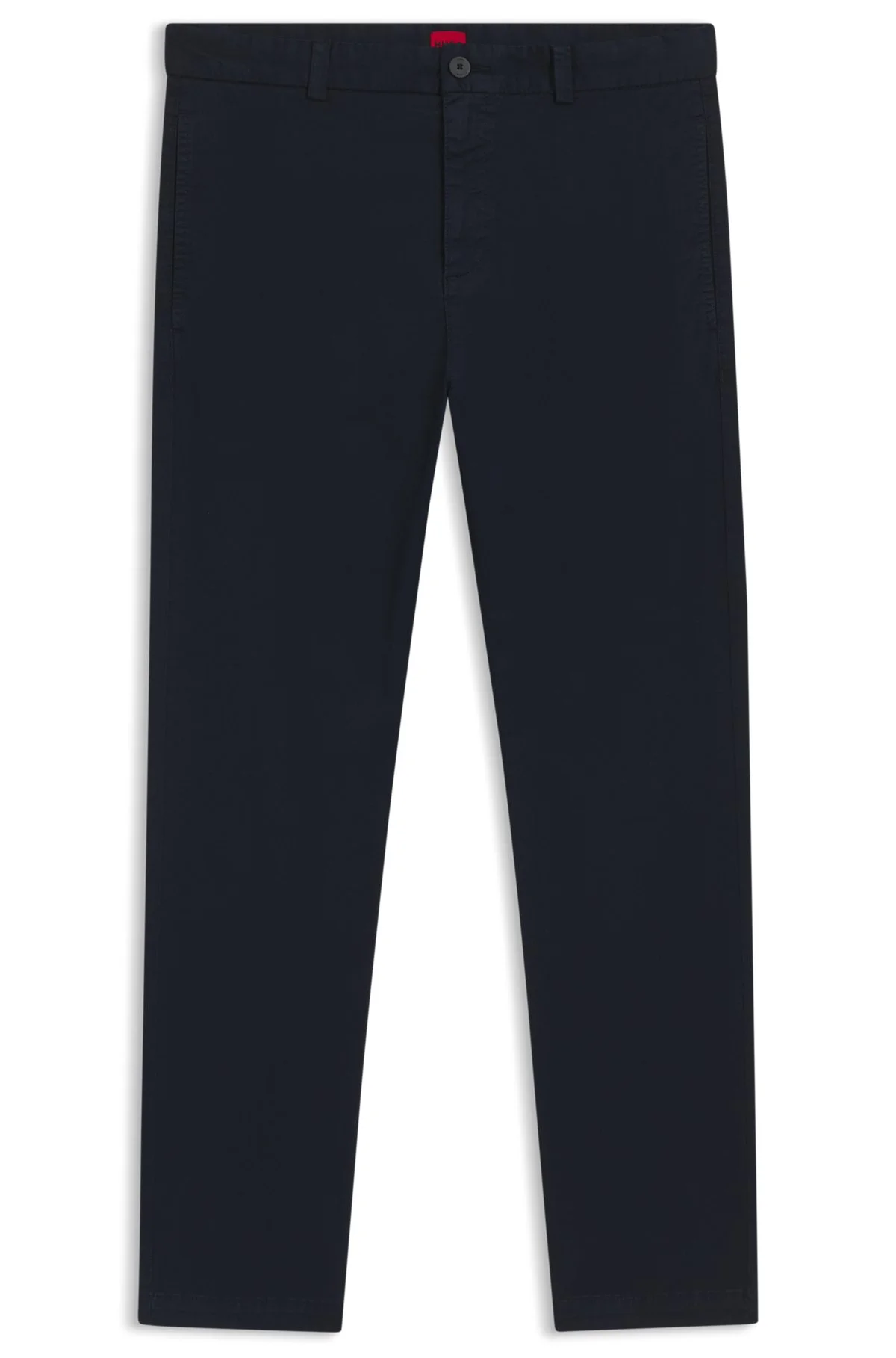 DETAILS Adaptable trousers by HUGO Menswear, cut to a defined fit. This pair is crafted in rich gabardine with stretch. Red logo label. Belt loops. Slim fit Regular rise Button and zip closure Slim leg Pockets bottom front: Side slash pockets Pockets bottom back: Welt pocket Fit foot width: 35,0 cm (13.8 inches) David251D - 50530886 QUALITY & CARE INSTRUCTIONS Do Not Bleach Machine Wash Cold Gentle Do Not Tumble Dry Iron Low Heat Reduced Dry Clean Material: 98% Cotton, 2% Elastane, pocketing: 100% Cotton