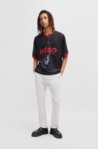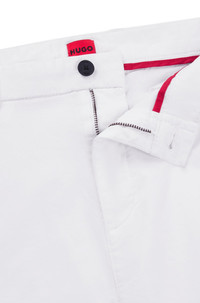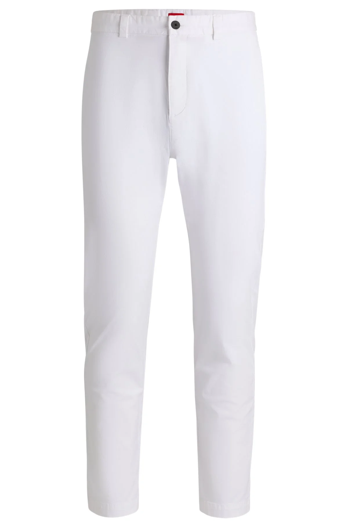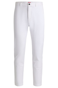 SIZE AND FIT The model wears a size 33/32 and is 6'3" tall with a, 35" chest, 31" waist and 35" hips. DETAILS David251D - 50530886 Adaptable trousers by HUGO Menswear, cut to a defined fit. This pair is crafted in rich gabardine with stretch. Red logo label. Belt loops. Slim fit Regular rise Button and zip closure Slim leg Pockets bottom front: Side slash pockets Pockets bottom back: Welt pocket Fit foot width: 35,0 cm (13.8 inches) QUALITY & CARE INSTRUCTIONS Do Not Tumble Dry Do Not Bleach Machine Wash Cold Gentle Quality: 98% Cotton, 2% Elastane, pocketing: 100% Cotton Iron Low Heat Reduced Dry Clean