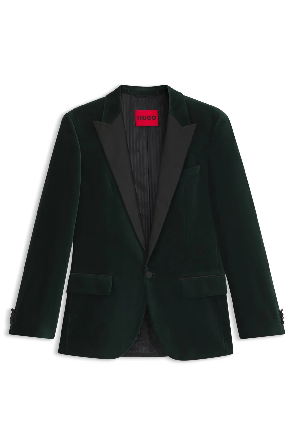 DETAILS Whether paired with jeans or tailored trousers, this HUGO Menswear tuxedo jacket is the ultimate evening option. Soft cotton velvet with satin trims. Defined fit. Slim fit Fully lined Fit back length: 74 cm (29 inches) Henry254E1X - 50549032 QUALITY & CARE INSTRUCTIONS Material: 100% Cotton, Lining: 55% Polyester, 45% Viscose, Collar: 100% Polyester, Sleeve lining: 100% Polyester Do Not Wash Do Not Bleach Iron Low Heat Reduced Dry Clean Do Not Tumble Dry