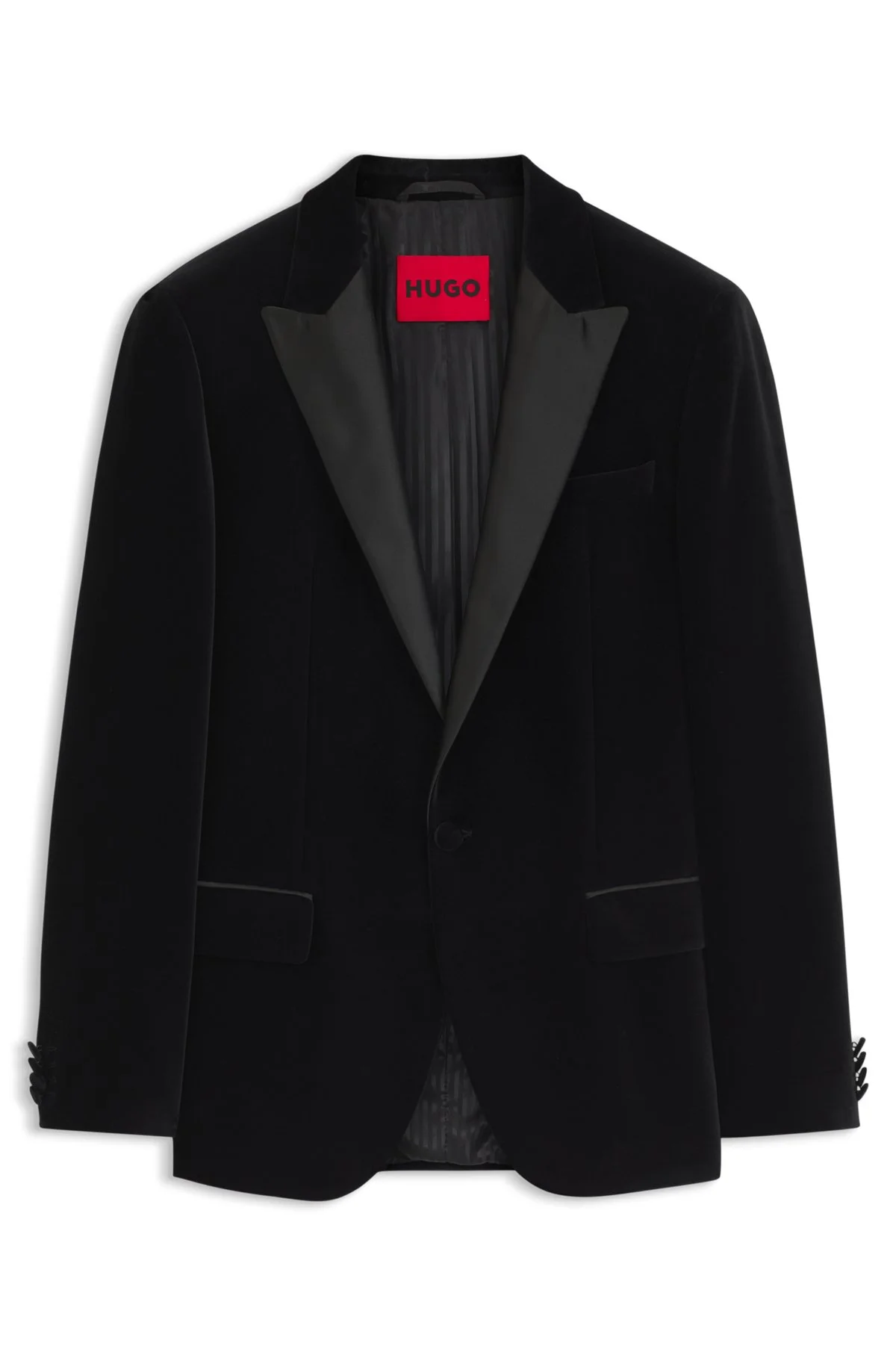 SIZE AND FIT The model wears a size 38R and is 6'2" tall with a, 36" chest, 28" waist and 36" hips. DETAILS Whether paired with jeans or tailored trousers, this HUGO Menswear tuxedo jacket is the ultimate evening option. Soft cotton velvet with satin trims. Defined fit. Slim fit Fully lined Fit back length: 74 cm (29 inches) Henry254E1X - 50549032 QUALITY & CARE INSTRUCTIONS Material: 100% Cotton, Lining: 55% Polyester, 45% Viscose, Collar: 100% Polyester, Sleeve lining: 100% Polyester Do Not Wash Do Not Bleach Iron Low Heat Reduced Dry Clean Do Not Tumble Dry