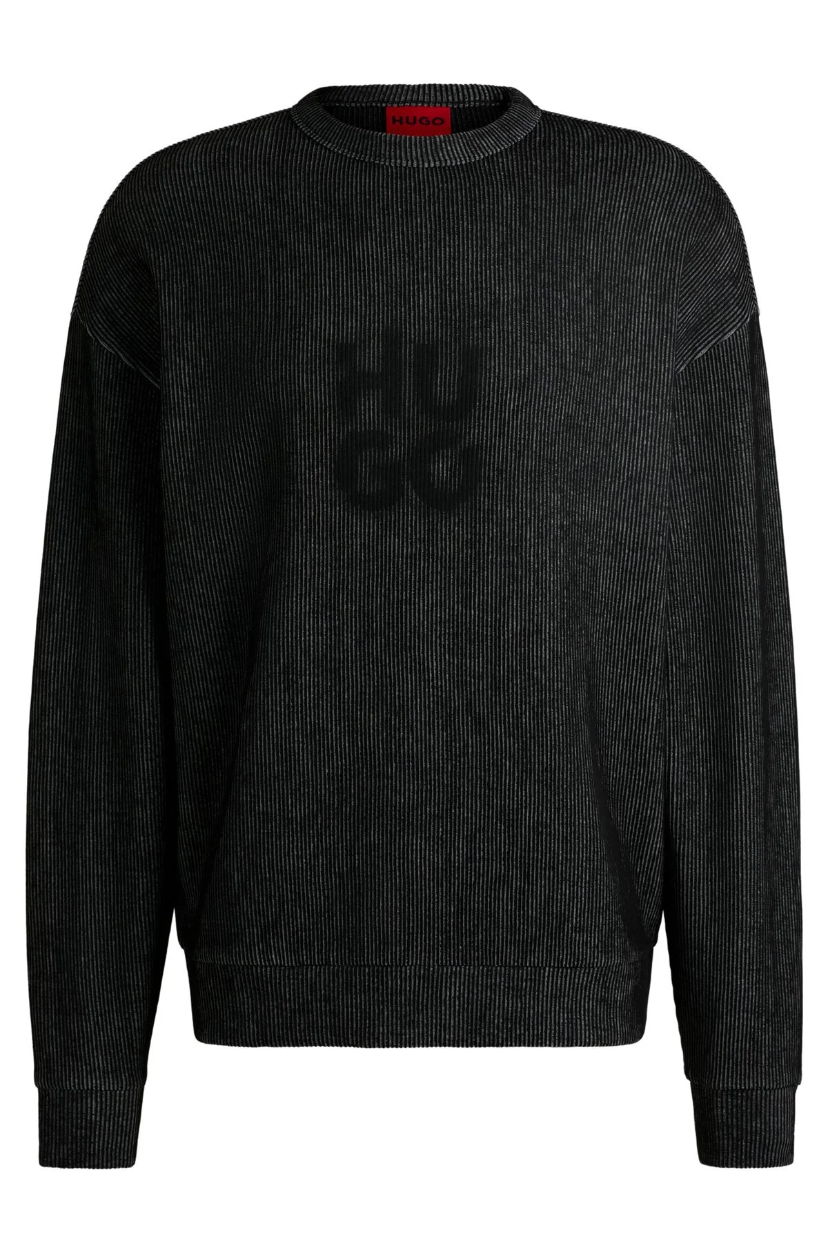 SIZE AND FIT The model wears a size M and is 6'3" tall with a, 35" chest, 31" waist and 35" hips. DETAILS Dinkam - 50531028 An oversize-fit sweatshirt in a flat-back ribbed cotton blend by HUGO Menswear. This two-tone piece features a stacked smoke logo print. Oversized fit Neckline: Crew neck Long sleeves No cuffs QUALITY & CARE INSTRUCTIONS Do Not Bleach Do Not Tumble Dry Do Not Dry Clean Iron Low Heat Machine Wash Cold Gentle Quality: 85% Cotton, 15% Polyester