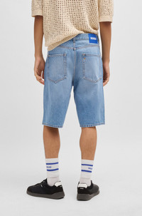 SIZE AND FIT The model wears a size 32 and is 6'1" tall with a, 33" chest, 25" waist and 35" hips. DETAILS Skate shorts - 50539816 With a blue hue and stonewashed finish, these straight-cut HUGO Menswear denim shorts are a summer essential. Logo details and whiskering for added character. Straight fit Regular rise Button closure Straight leg Pockets bottom front: Side pockets Pockets bottom back: Patch pocket QUALITY & CARE INSTRUCTIONS Do Not Bleach Do Not Tumble Dry Machine Wash Cold Gentle Quality: 100% Cotton, pocketing: 100% Cotton Iron Medium Heat Do Not Dry Clean
