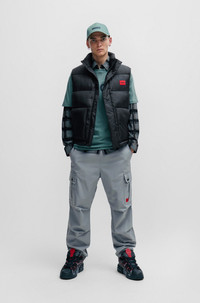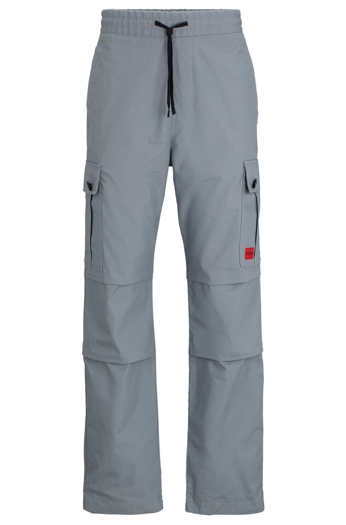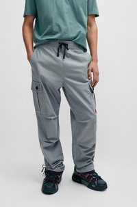 SIZE AND FIT The model wears a size EU:32R and is 6'1" tall with a, 35" chest, 28" waist and 36" hips. DETAILS Garlo233 - 50493865 Regular-rise trousers cut to a straight fit with a tapered leg by HUGO Menswear, featuring buttoned cargo pockets and a red logo label. Slim fit Regular rise Elastic Waistband Tapered leg Pockets bottom front: Side slash pockets Pockets bottom back: Welt pocket QUALITY & CARE INSTRUCTIONS Iron Low Heat Machine Wash Cold Gentle Reduced Dry Clean Do Not Bleach Do Not Tumble Dry Quality: 100% Cotton, pocketing: 65% Polyester, 35% Cotton