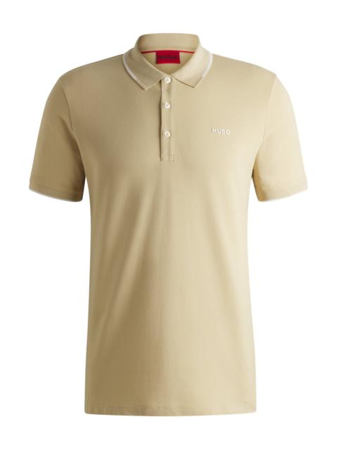 SIZE AND FIT The model wears a size M and is 6'2" tall with a, 35" chest, 27" waist and 35" hips. DETAILS Dinoso222 - 50467344 A slim-fitting polo shirt by HUGO Menswear, cut in stretch-cotton pique. Sporty style with a printed logo at the chest and contrast tipping. Slim fit Neckline: Flat-knit collar Number of buttons: 3 Flat-knit cuffs Standard length QUALITY & CARE INSTRUCTIONS Quality: 93% Cotton, 7% Elastane Iron Low Heat Machine Wash Cold Gentle Do Not Bleach Do Not Tumble Dry Do Not Dry Clean