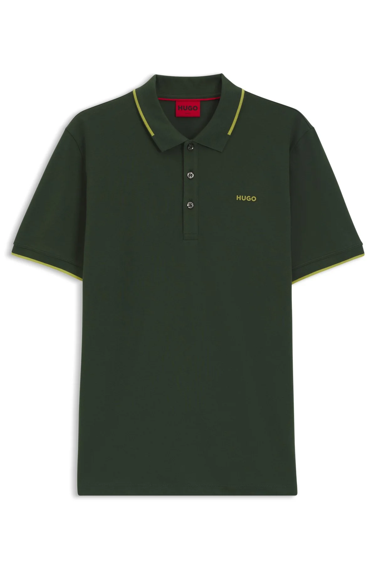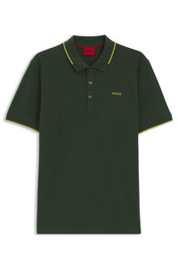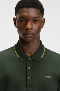 SIZE AND FIT The model wears a size L and is 6'2" tall with a, 31" chest, 26" waist and 35" hips. DETAILS Dinoso222 - 50467344 A slim-fitting polo shirt by HUGO Menswear, cut in stretch-cotton pique. Sporty style with a printed logo at the chest and contrast tipping. Slim fit Neckline: Flat-knit collar Number of buttons: 3 Flat-knit cuffs Standard length QUALITY & CARE INSTRUCTIONS Iron Low Heat Do Not Tumble Dry Do Not Bleach Do Not Dry Clean Machine Wash Cold Gentle Quality: 93% Cotton, 7% Elastane
