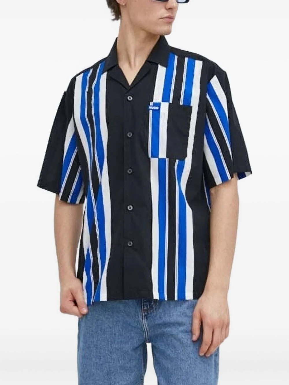 striped short-sleeve shirt Highlights - Black - Vertical stripes - Short sleeves - Camp collar - Chest pocket - Logo patch Imported Composition Cotton 100% Washing instructions Read Manufacturer Guidelines