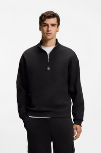 DETAILS With a stacked logo and geometric sleeve tape, this relaxed zip-neck HUGO Menswear sweatshirt makes a fresh layering option. With stretch. Relaxed fit Neckline: Zip neck Fastening top: Zip closure Long sleeves Ribbed cuffs Standard length Danovotop - 50546402 QUALITY & CARE INSTRUCTIONS Do Not Bleach Do Not Dry Clean Material: 82% Cotton, 13% Polyester, 5% Elastane Machine Wash Cold Gentle Do Not Tumble Dry Iron Low Heat