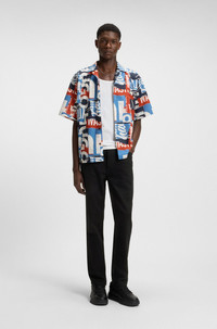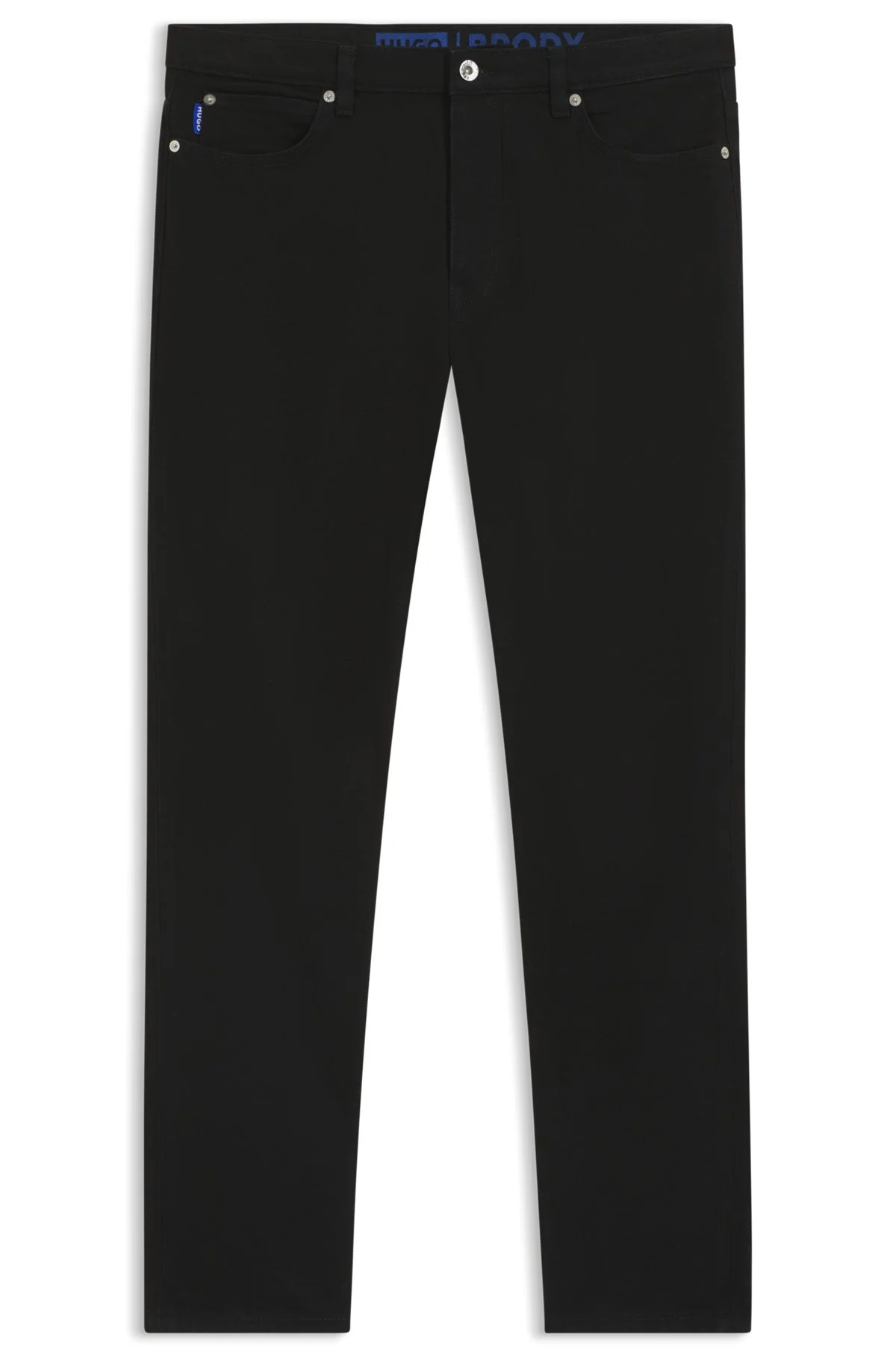 SIZE AND FIT The model wears a size 32/32 and is 6'2" tall with a, 36" chest, 28" waist and 37" hips. DETAILS Brody - 50511504 Black jeans by HUGO Menswear, crafted in stretch denim for easy movement. This regular-rise pair is cut to a tapered fit with signature trims. Tapered fit Regular rise Button closure Pockets bottom front: Side pockets Tapered leg Pockets bottom back: Patch pocket Standard length Fit foot width: 34,0 cm (13.4 inches) QUALITY & CARE INSTRUCTIONS Do Not Bleach Do Not Tumble Dry Quality: 99% Cotton, 1% Elastane, pocketing: 100% Cotton Iron Medium Heat Do Not Dry Clean Machine Wash Cold Gentle