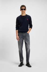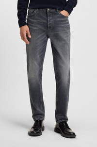 DETAILS HUGO 634 - 50547274 With a soft used wash and distressed details, these HUGO Menswear jeans are a fresh casual option. Modern tapered fit. Gray stretch denim. Tapered fit Regular rise Button closure Pockets bottom front: Side pockets Tapered leg Pockets bottom back: Patch pocket Standard length Fit foot width: 34,0 cm (13.4 inches) QUALITY & CARE INSTRUCTIONS Do Not Tumble Dry Machine Wash Cold Gentle Quality: 99% Cotton (5% recycled), 1% Elastane, pocketing: 100% Cotton Iron Medium Heat Do Not Bleach Do Not Dry Clean
