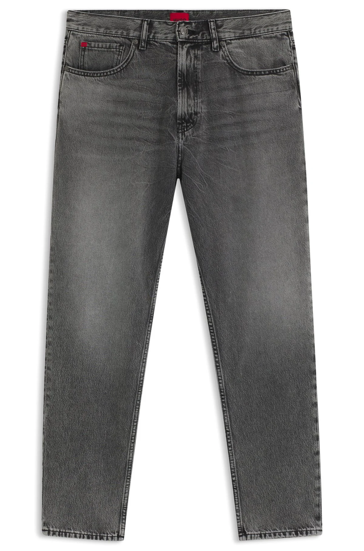 SIZE AND FIT The model wears a size 32/32 and is 6'2" tall with a, 31" chest, 26" waist and 35" hips. DETAILS HUGO 838 - 50542889 Cut to sit low on the hips, these tapered-fit HUGO Menswear jeans are a modern foundation. Weighty gray denim with soft used effects. Tapered fit QUALITY & CARE INSTRUCTIONS Do Not Tumble Dry Do Not Dry Clean Quality: 100% Cotton, pocketing: 65% Polyester, 35% Cotton Machine Wash Cold Gentle Do Not Bleach Iron Medium Heat