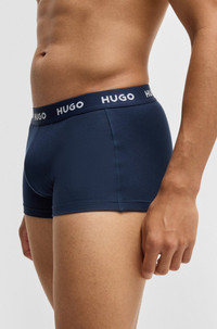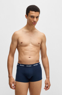 SIZE AND FIT The model wears a size M and is 6'1" tall with a, 38" chest, 29" waist and 38" hips. DETAILS TRUNK TRIPLET PACK - 50532611 Three pairs of signature trunks by HUGO Menswear. Featuring repeat logos on the low-rise waistband, each pair is crafted in stretch jersey. Low rise QUALITY & CARE INSTRUCTIONS Iron Low Heat Do Not Bleach Do Not Dry Clean Quality: 95% Cotton, 5% Elastane, Waistband: 55% Polyamid, 33% Polyester, 12% Elastane Machine Wash Warm Tumble Dry Low Heat