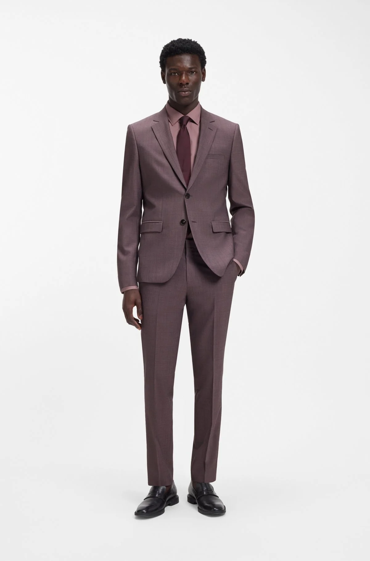 SIZE AND FIT The model wears a size 38R and is 6'1" tall with a, 33" chest, 28" waist and 34" hips. DETAILS With its super-slim fit and wool-blend poplin, this two-piece HUGO Menswear suit is the ideal formal combination. Versatile melange effect. Extra-slim fit Notched lapels Number of buttons: 2 Welt chest pockets Pockets top: Flap pockets Inside jet pocket with button Button cuffs Side vent Fully lined Fit back length: 72 cm (28 inches) Fit foot width: 36,0 cm (14.2 inches) Arti-Hesten253X - 50553786 QUALITY & CARE INSTRUCTIONS Reduced Dry Clean Do Not Bleach Do Not Tumble Dry Do Not Wash Material: 55% Virgin wool, 45% Polyester, Lining: 100% Viscose, Sleeve lining: 100% Polyester, pocketing: 100% Cotton, knee lining: 100% Viscose Iron Low Heat