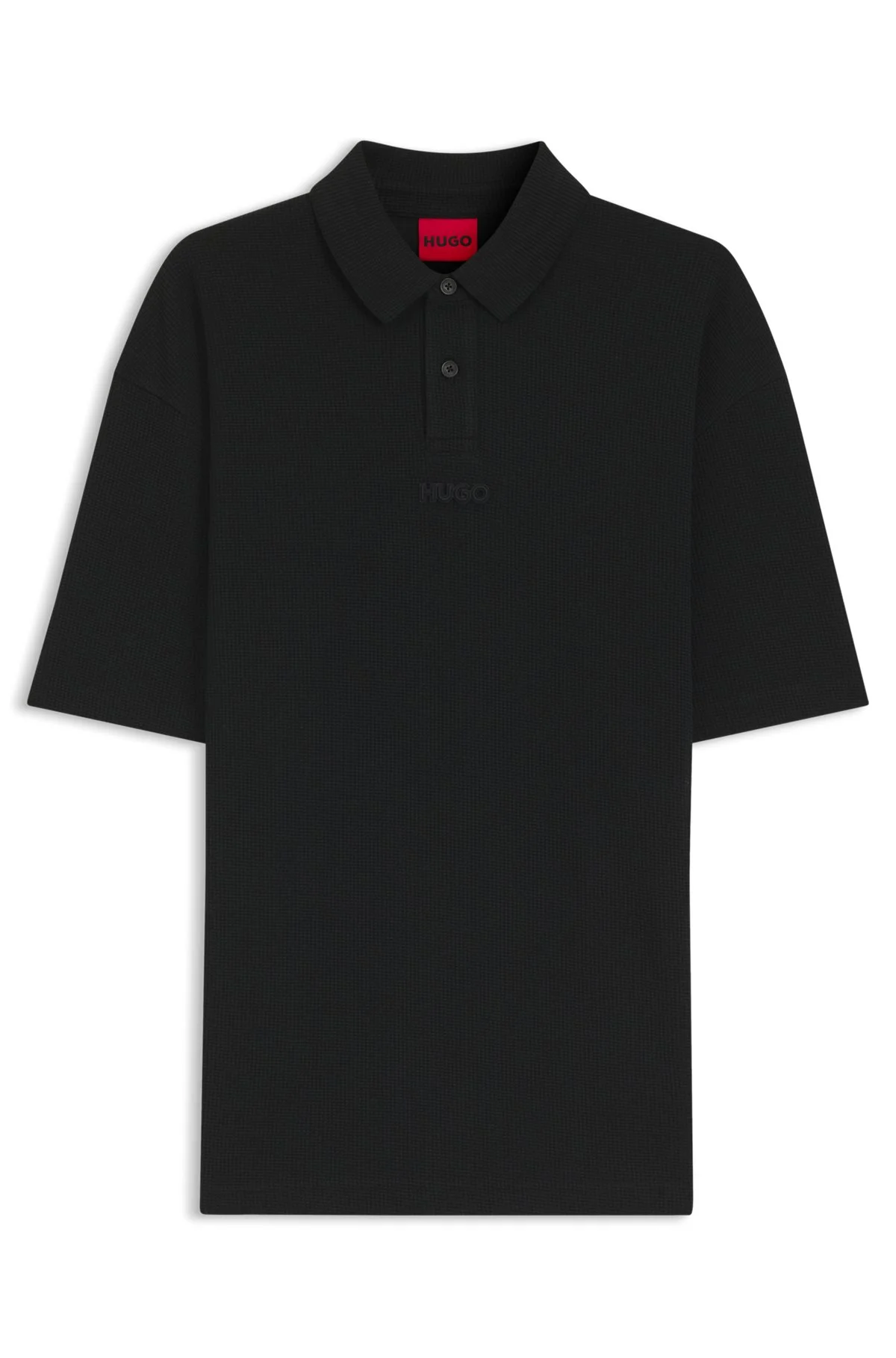DETAILS With a rich waffle structure in breathable cotton, this HUGO Menswear polo shirt balances form and function. Relaxed fit with a tonal logo detail. Relaxed fit Neckline: Polo collar Number of buttons: 2 Short sleeves Standard length Diffys - 50553074 QUALITY & CARE INSTRUCTIONS Do Not Bleach Do Not Dry Clean Do Not Tumble Dry Iron Low Heat Material: 100% Cotton Machine Wash Cold Gentle