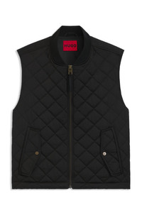 DETAILS Bicolino2541 - 50546232 Designed in quilted satin with ribbed trims, this regular-fit HUGO Menswear gilet is a distinctive way to layer up. Adjustable hem. Water-repellent finish. Regular fit Stand collar Stand collar Fastening top: Zip closure Pockets top: Flap pockets Inside welt pockets Fully lined Standard length Fit back length: 67 cm (26 inches) QUALITY & CARE INSTRUCTIONS Do Not Dry Clean Machine Wash Cold Gentle Iron Low Heat Tumble Dry Low Heat Quality: 100% Polyester, Lining: 100% Polyester, Knitwear: 95% Polyester, 5% Elastane, Wadding: 100% Polyester Do Not Bleach