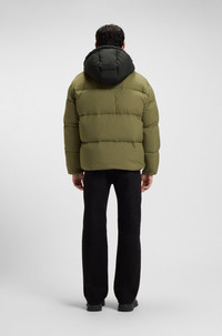 SIZE AND FIT The model wears a size M and is 6'0" tall with a, 33" chest, 27" waist and 35" hips. DETAILS With a water-repellent finish and adjustable hood, this relaxed HUGO Menswear padded jacket is essential in unpredictable weather. Cozy pocket lining. Blue logo label. Relaxed fit Hooded collar Fastening top: Zip closure Inside welt pockets Elasticized cuffs Fully lined Standard length Bodo2541 - 50546652 QUALITY & CARE INSTRUCTIONS very mild professional wet clean Do Not Wash Do Not Bleach Do Not Dry Clean Iron Low Heat Do Not Tumble Dry Quality: 100% Polyamide, Lining: 100% Polyamid, Filling: 100% Polyester, Hood: 100% Polyamide