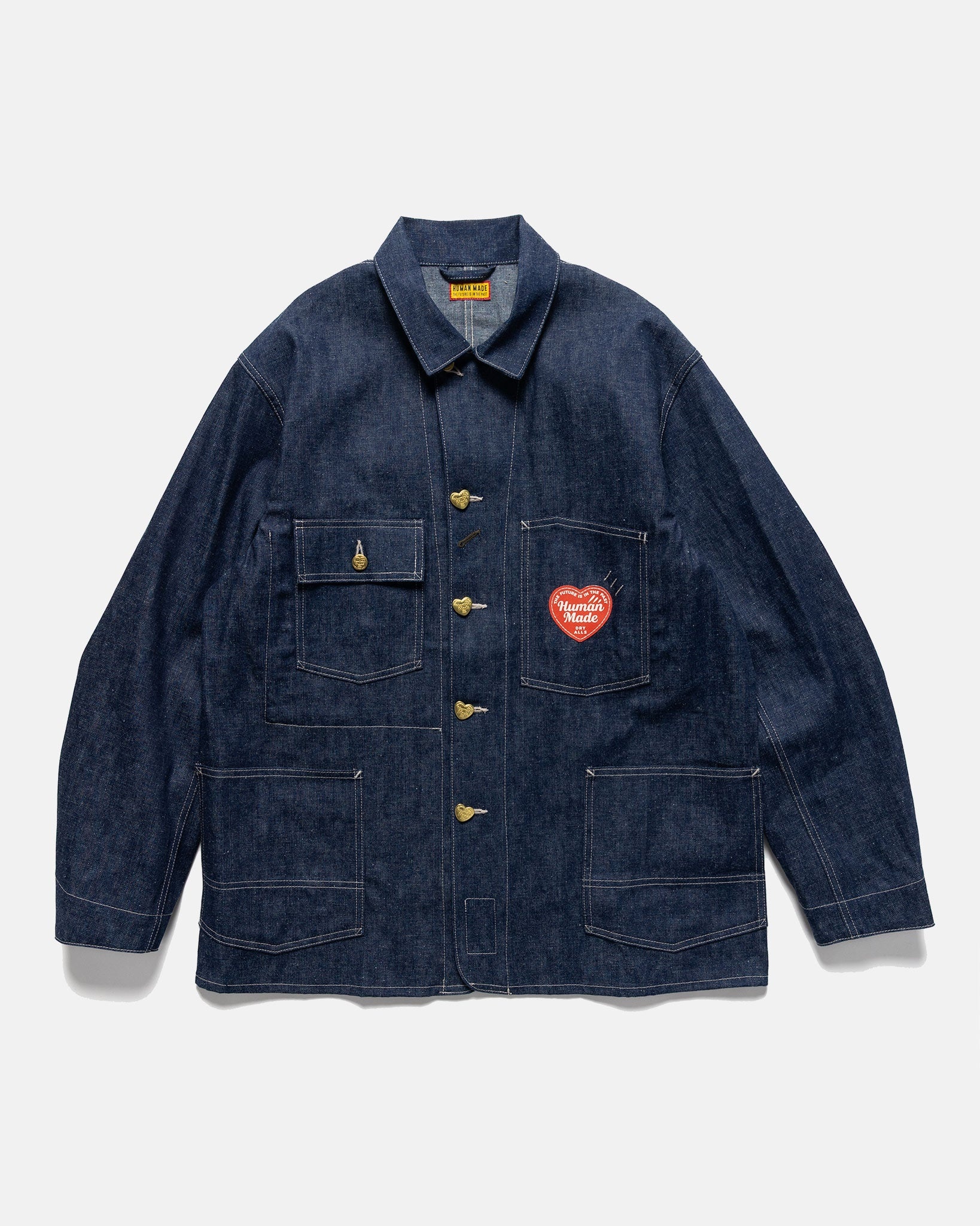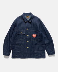 The Human Made Denim Coverall Jacket draws inspiration from classic western and workwear silhouettes, reinterpreted with the brand’s signature aesthetic and iconic details. Crafted from lightweight selvedge denim with a loose, slubby weave, this jacket showcases textural character and durability. Over time, the attached paper label on the chest pocket will naturally peel away, revealing intricate heart-shaped stitching underneath, giving the piece a personalized and evolving character with each wash. DETAILS - HM29JK004 - 100% Cotton - Lightweight selvedge denim - Two large patch chest pockets - Two large patch hand pockets - Button closure - Button cuff - Custom Heart rivet buttons throughout - Stitched on paper heart label at left chest pocket - Made in Japan