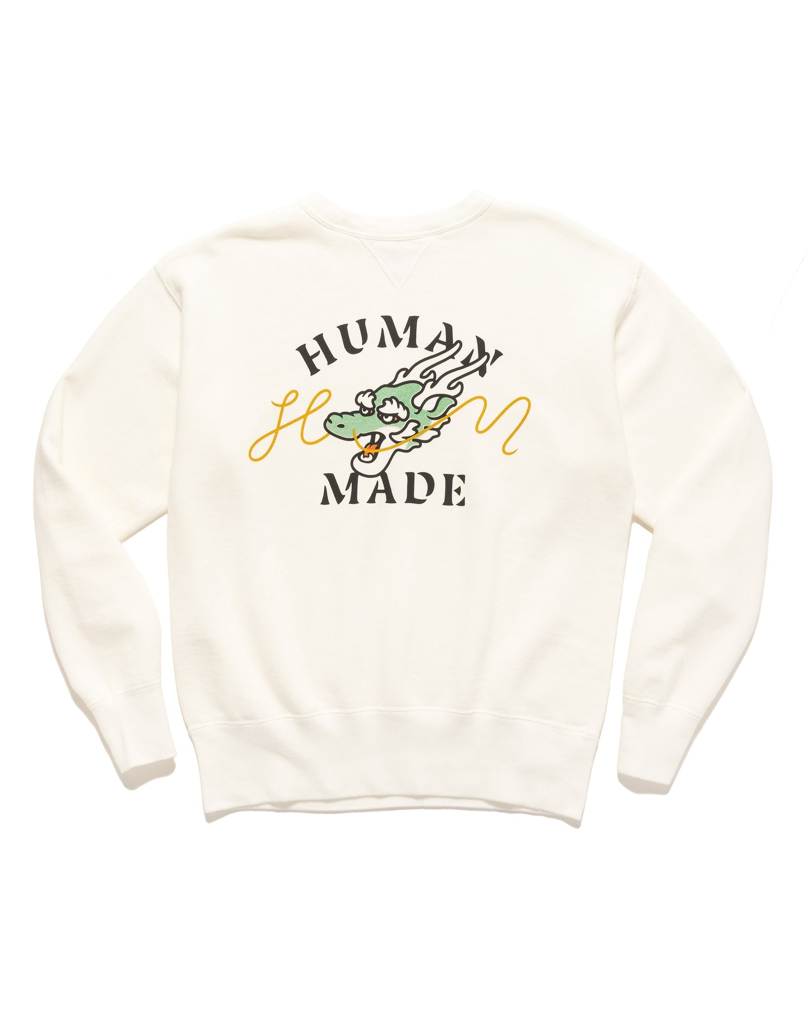 In celebration of the Year of the Dragon, Human Made have given their iconic graphic treatment to the fiery creature across a range of their classic products. This crew neck sweatshirt is made of a comfortable cotton fleece fabric woven using a rare method called "loop knitting", giving a robust but soft handle. It features a wide box silhouette and original graphics. DETAILS - HM27CS023 - 100% cotton, loopknit - Ribbed cuffs, collar and hem - Printed chest graphic - Chain-stitched tab at the hem - Made in Japan