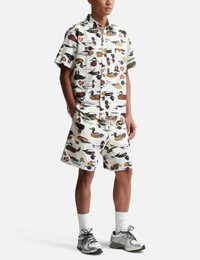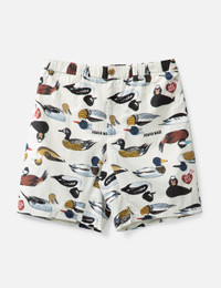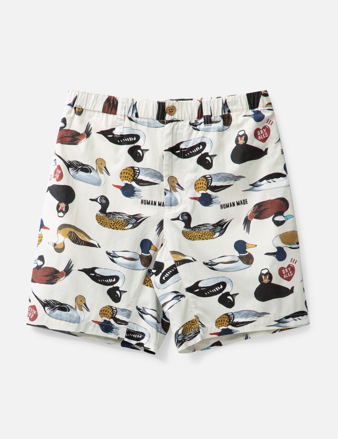 - Human Made - Duck Shorts - Zip fly with button closure - Heart shaped button detailing at center - Elastic waistband - Adjustable drawstring - Front side pockets - Back welt pocket - All-over print featuring duck graphics - Color: White - Material: 100% Cotton - See more Shorts and Clothing SIZING - Model wears size L - Model measures: Height 183cm, Chest 35.5”/90cm, 30”/76cm, Hip 33”/84cm