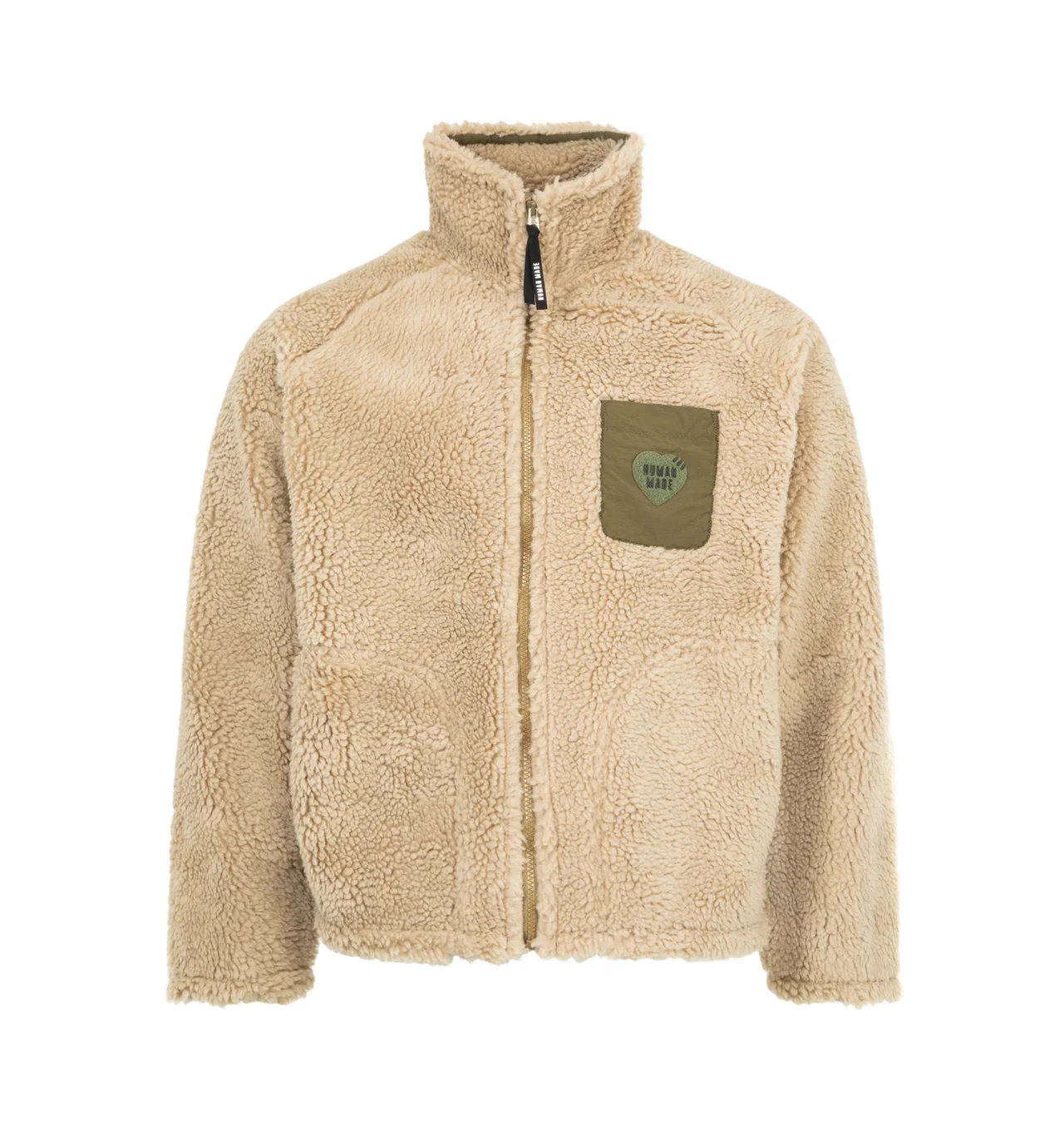 HUMAN MADE Fleece Jacket featuring soft polyester boa fabric, heart-shaped magic tape on the left chest pocket, removing the tape reveals a text graphic, contrasting piping and pockets, chain-stitched animal graphic on the back, heart-shaped snap buttons on the cuffs and mesh lining with wind-proof film. 100% polyester. Contrast: 100% nylon. DESIGNER STYLE ID: HM30JK025 COLOR: BEIGE