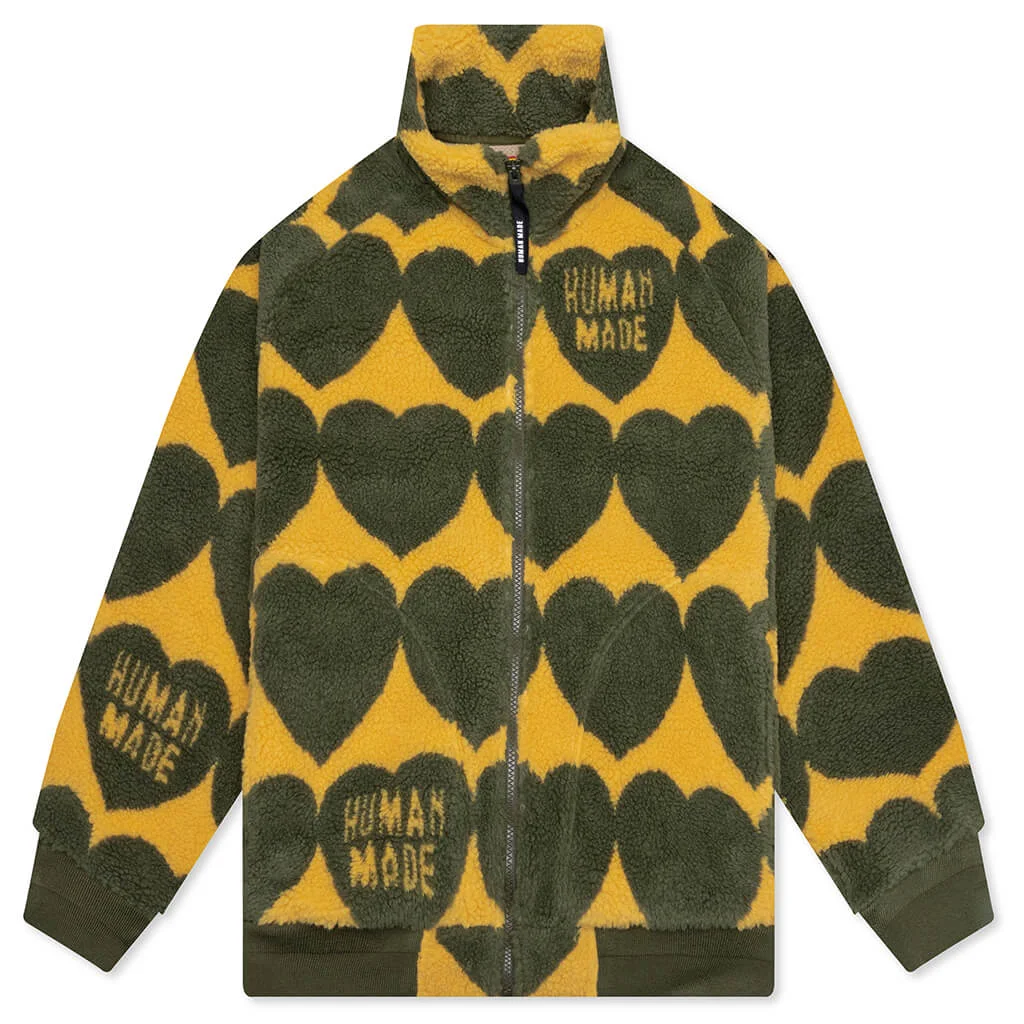 The Heart Fleece Jacket by Human Made is adorned with a heart pattern jacquard. Crafted from polyester, it is designed to have a relaxed fit with a high neck collar. Including a full zipper closure up, the jacket is decorated with wool-printed logos on the front and back. - 100% Polyester - High neck - Heart pattern jacquard - Wool-printed logos - Style No: HM30JK026-OLI