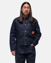 Human Made's take on the classic trucker jacket. Crafted from lightweight selvedge denim with a loose, slubby weave, this jacket showcases textural character and durability. Adorned with classic details from its references pieces and updating them with iconic Human Made design. Over time, the denim will soften and fade, and the attached paper label on the chest pocket will naturally peel away, revealing intricate heart-shaped stitching underneath, giving the piece a personalized and evolving character with each wash. DETAILS - HM29JK002 - 100% Cotton - Lightweight selvedge denim - Button flap closure patch chest pocket - Button closure - Button cuff - Rivet buttons throughout - Pleated chest detail - Adjustable cinch back - Stitched on paper heart label at chest pocket - Made in Japan
