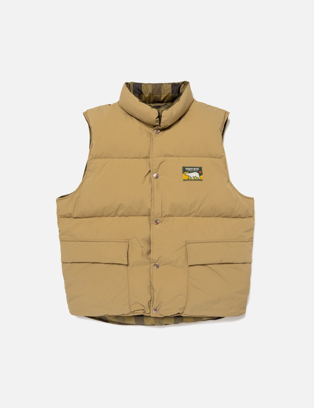 - Human Made - Reversible Down Vest - Simple, plain nylon main side with logo patch at chest and large graphics at rear - All-over check pattern at reverse with heart logo patch at chest and chain-stitched logo at rear - Snap button closure - Two large front pockets - Color: Beige - Material: 100% Nylon; Filling: More than 85% Duck Down - See more Vests and Clothing