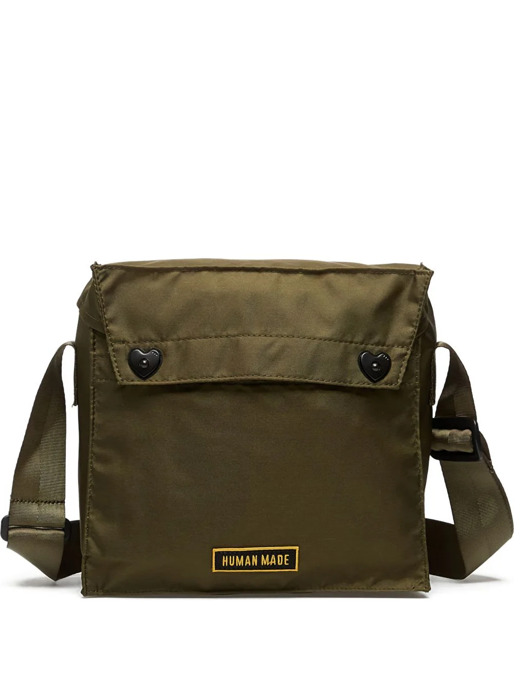 heart-embellished military messenger bag Highlights - Green - Heart detail - Adjustable shoulder strap - Front flap - Internal slip pocket Imported Composition Outer: Nylon 100% SIZE & FIT Measurement DEPTH 3.74 in(9.5 cm) HEIGHT 8.66 in(22 cm) WIDTH 8.85 in(22.5 cm)