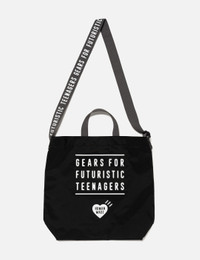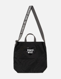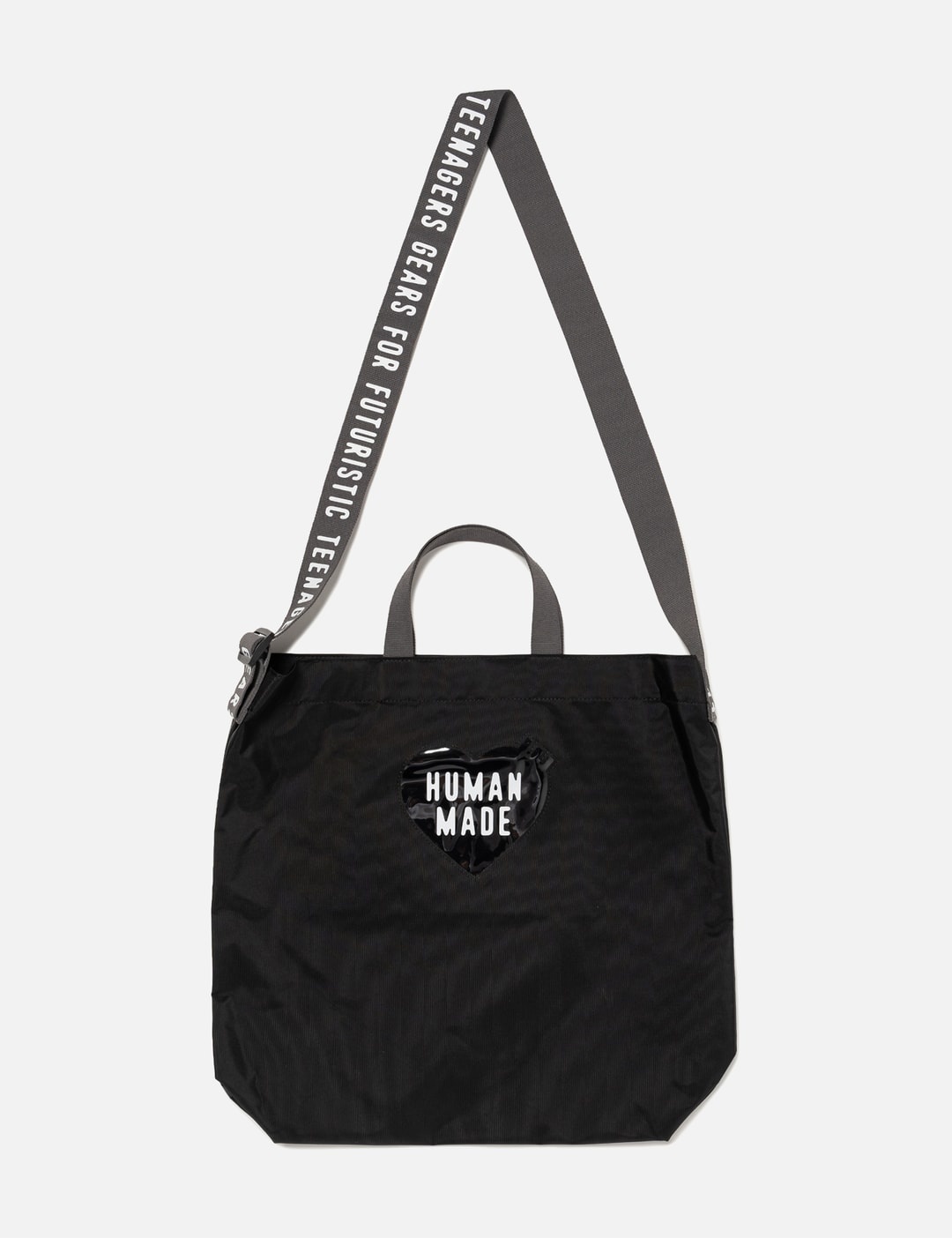 - Human Made - Shoulder Tote Bag - Two-way nylon bag - Adjustable shoulder strap - Top handles - PVC heart logo - Graphic print - Inner pocket - Color: Black - Material: 100% Nylon; Partly PVC - See more Tote Bags, Bags and Accessories SIZING Approximate dimensions: - Height: 39cm - Width: 44cm - Depth: 12cm - Handle Length: 12cm - Strap Length: 49cm