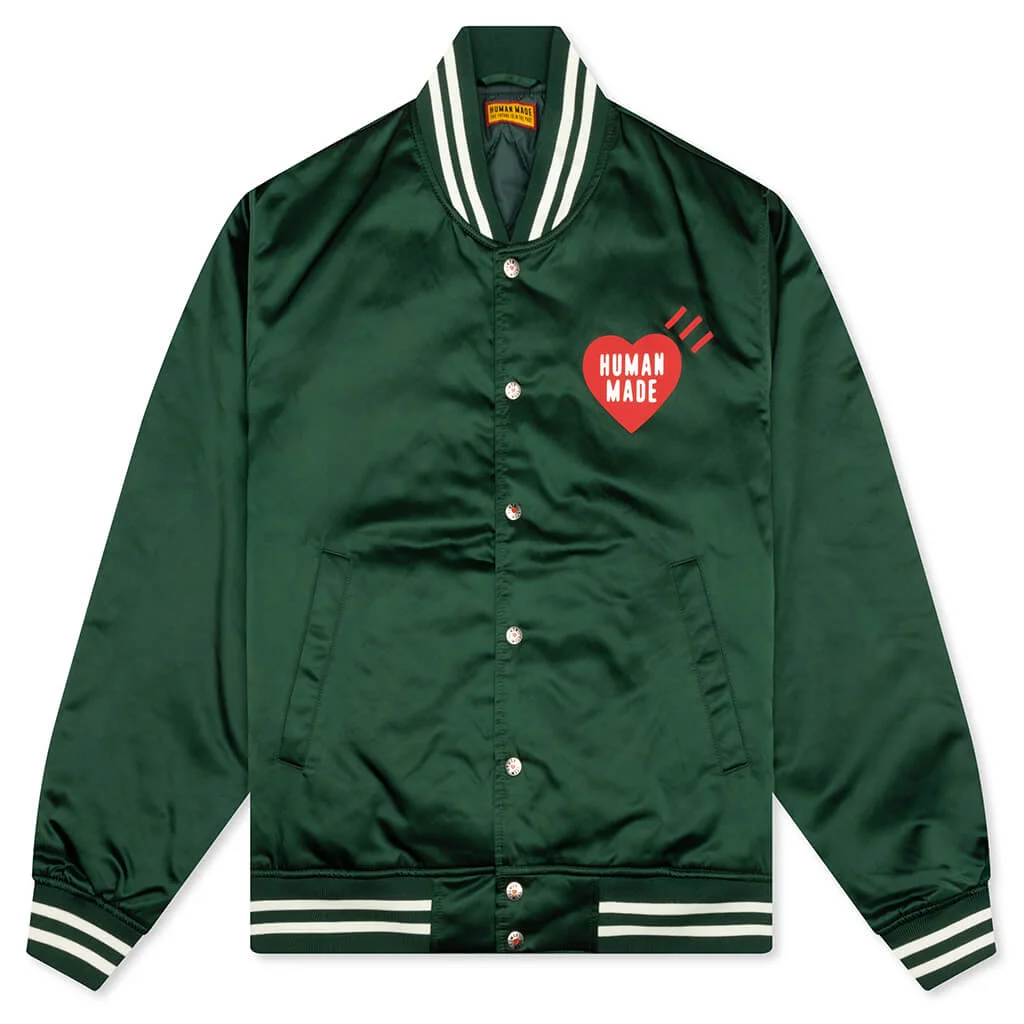 The Nylon Stadium Jacket in Black is made from durable nylon and features a ribbed knit collar and cuffs for a comfortable fit. With a button closure, it showcases screen-printed branding on the front and back, adding a stylish touch to your outerwear collection. - 100% Nylon - Ribbed knit collar - Ribbed cuffs - Button closure - Screen printed branding on front and back - Style No: HM30JK038-GRN