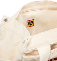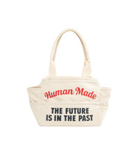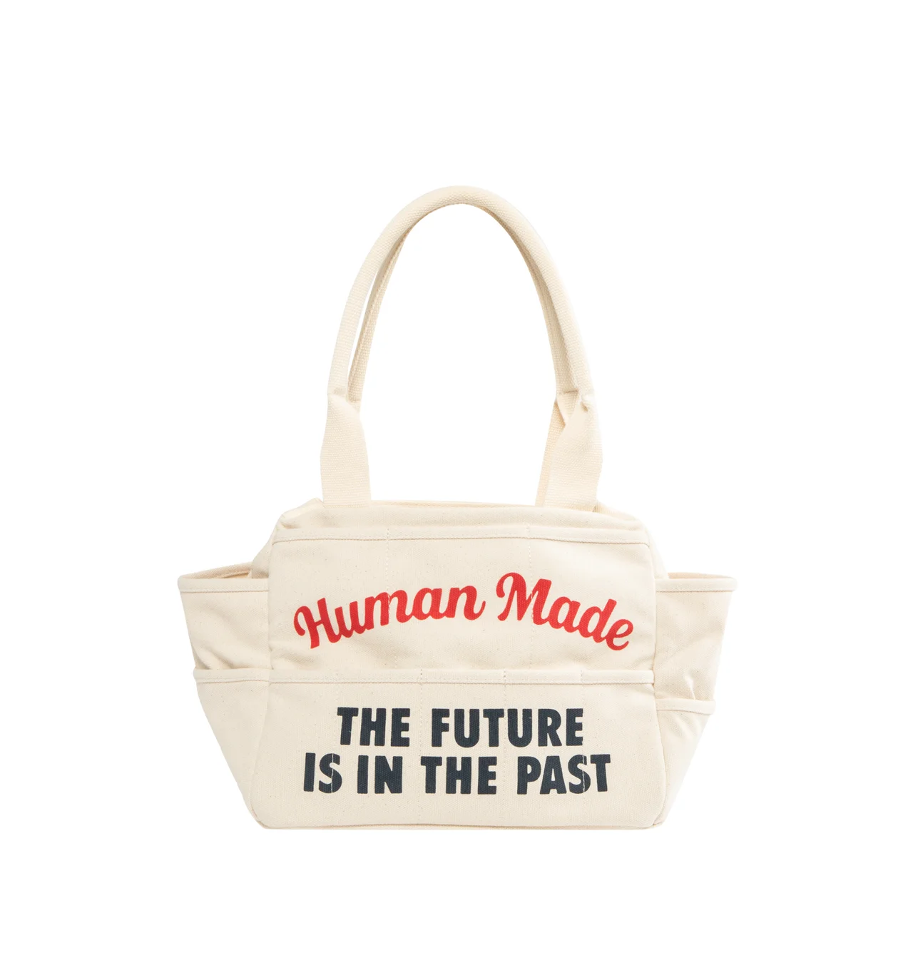 HUMAN MADE Tool Bag featuring multi-pockets, made from thick, tough 18oz cotton canvas, convenient diagonal pockets below the heart patch, snap buttons for adjusting the gussets, handle also allows for shoulder carrying, graphics on both sides, Heart patch, heart name tag on the inside and A4-sized storage. 100% cotton. DESIGNER STYLE ID: HM30GD018 COLOR: WHITE