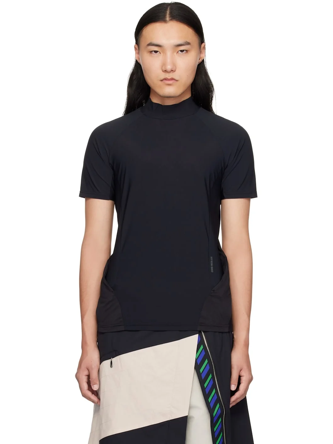 Nylon-blend jersey T-shirt. · Mock neck · Mesh straps at sides with concealed zip pockets Supplier color: Black Body: 77% nylon, 23% polyurethane. Trim 1: 85% nylon, 15% polyurethane. Trim 2: 92% polyester, 8% polyurethane. Made in South Korea 251429M213005