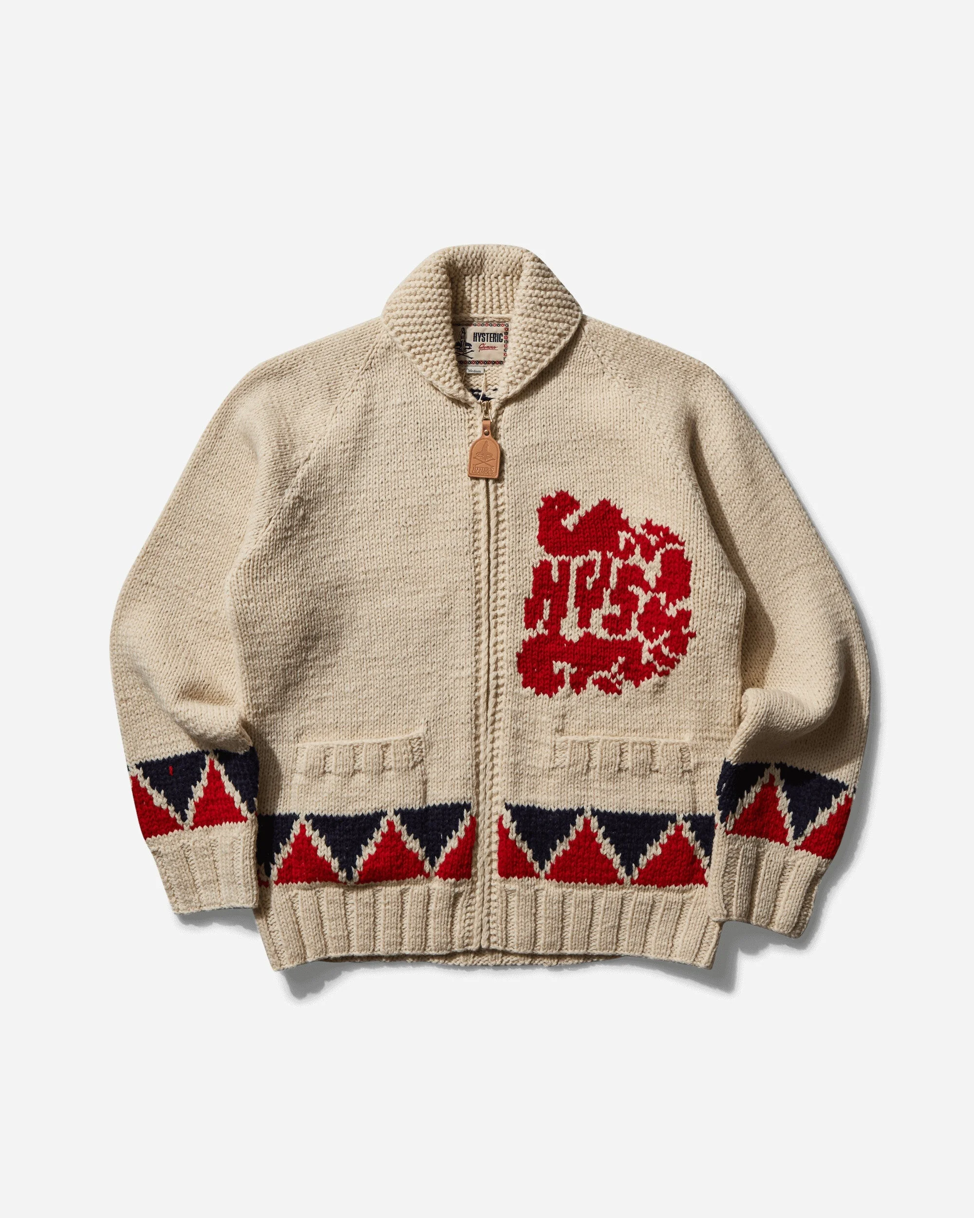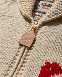 Hysteric Glamour Multi Woman Zip Cardigan Dirty White Crafted from premium wool, it features ribbed trims with contrasting stripes, a zip-up closure, and a relaxed fit for everyday comfort. - 100% Wool - Relaxed Fit - Ribbed Collar, Cuffs and Hem - Knitted Graphic at Front and Back - Zip Closure - Leather Pull Tab - Two Patch Pockets - Made in Japan - Style Code: ND06 A