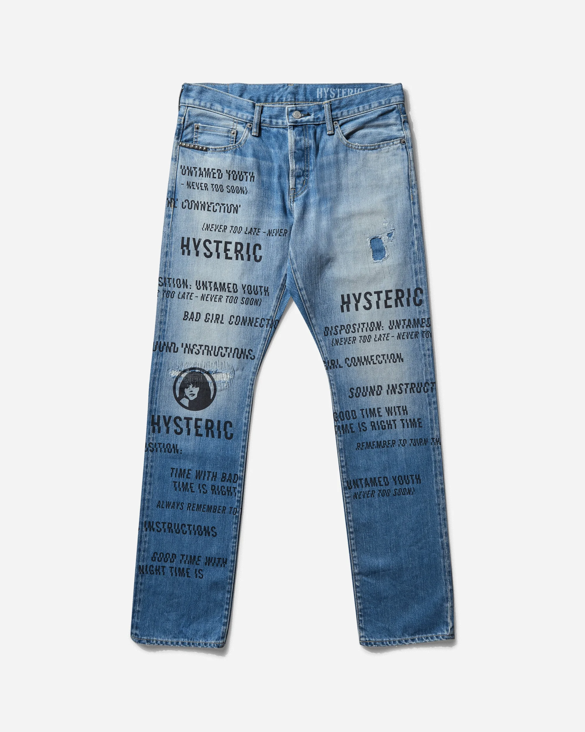 Hysteric Glamour Slash Type Logo Jeans Indigo These indigo jeans feature lyrics that evoke the sound are arranged in a misaligned balance, creating a motif with a trippy feel. The silhouette is Hysteric Glamour's classic slim straight pants, finished with a faded process. - 100% Cotton - Regular Fit - Straight Leg - Button-Fly - Five-Pocket Construction - All-Over Printed Graphic - Leather Logo Patch - Made in Japan - Style Code: AP08 A