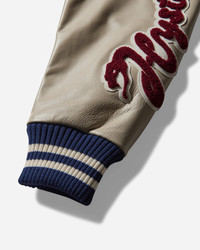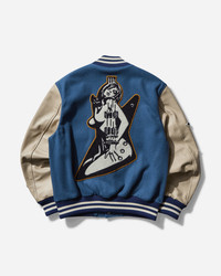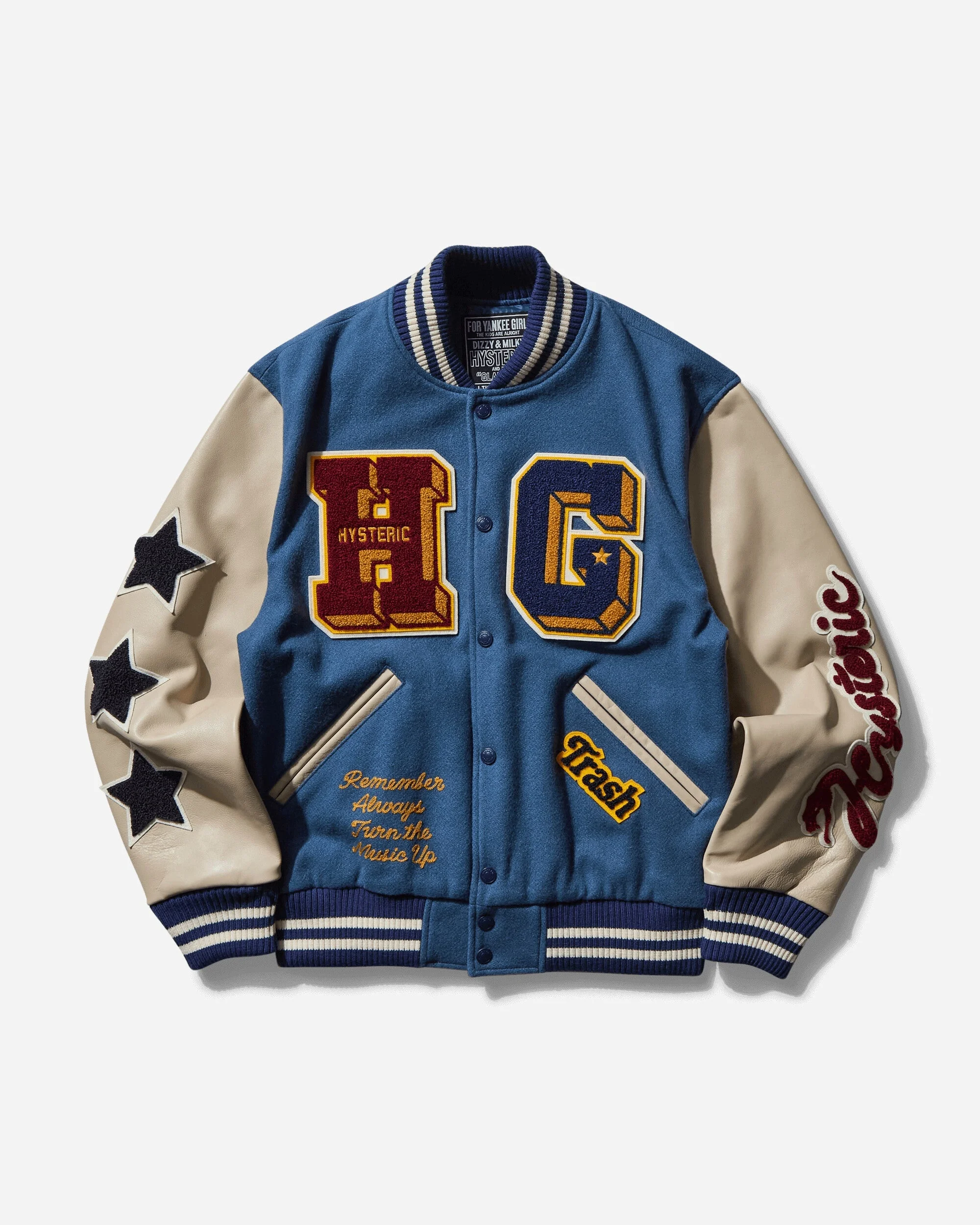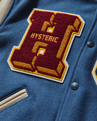 Hysteric Glamour Turn The Music Up Stadium Jacket Turquoise This stadium jacket is made of Melton fabric that reproduces the texture of vintage materials, and the sleeves are made of high-quality cowhide. The jacket features multiple patches, snap-button closure and two front pockets. - 90% Wool, 10% Nylon - Regular Fit - Ribbed Collar, Cuffs and Hem - Snap-Button Closure - Cowhide Sleeves - Two Front Pockets - Interior Pocket - Multiple Patches at Front, Sleeves and Back - Made in Japan - Style Code: AB10 B