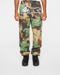 Relaxed-fit cargo pants featuring an allover camo print with tonal currency graphics and a bold Running Dog graphic across the front. - Camo - Screen-printed Running Dog graphic at front - Multiple cargo pockets - Button and zip fly closure - Relaxed straight-leg fit - 100% Cotton