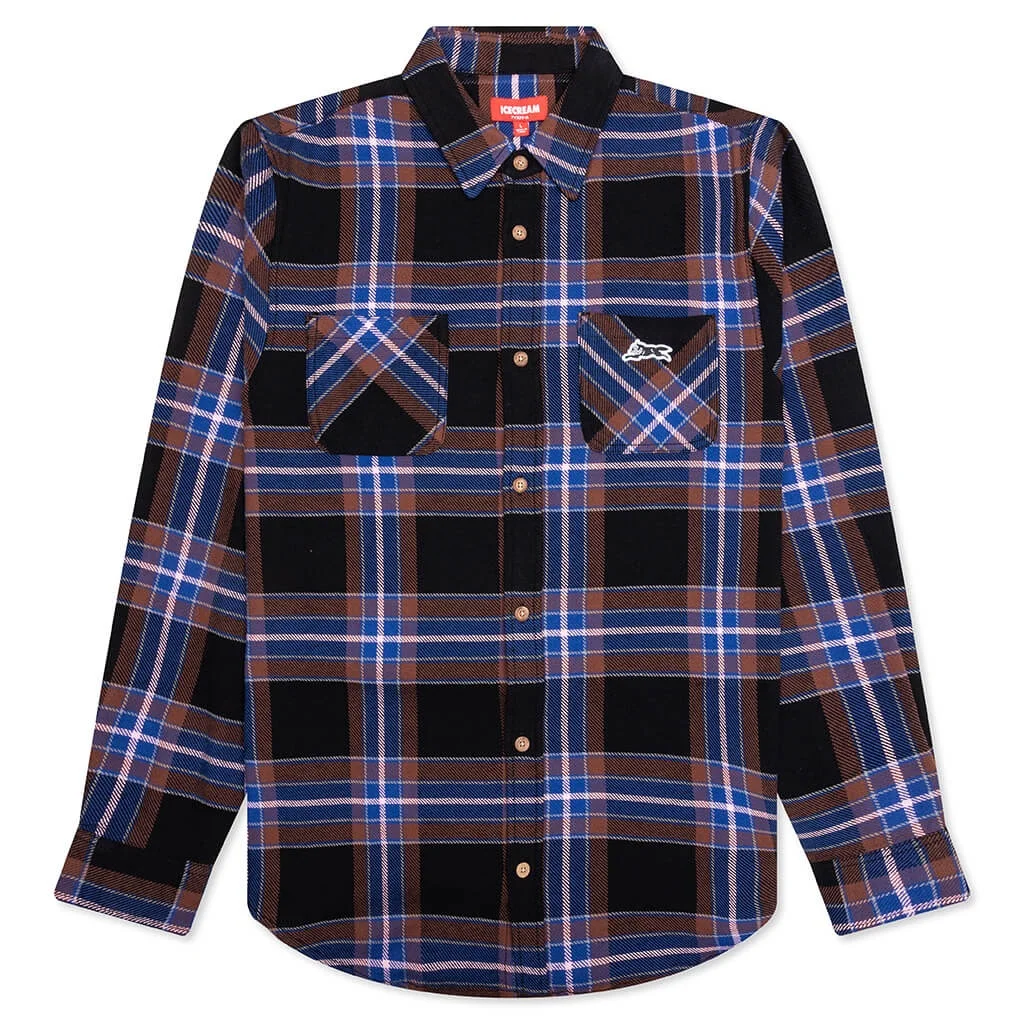 Icecream adds to its latest collection with the Big Drip L/S Woven. This plaid button-down shirt features two chest pockets for storage, a button-down closure, pointed collar, and straight hem. Signature Icecream branding wraps up the look. 451 1601 PLAI - 100% Cotton - Button closure - Pointed collar - Chest pockets - Button cuffs - Running dog motif - Style No: 451-1601-55