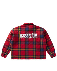 The Buffalo Shacket features nylon quilted lining, a plaid print throughout, along with a running dog embroidery on the front left pocket and the Icecream logo printed on the back. - Goji Berry - Nylon Quilted lining - Plaid print - Running Dog embroidery on the front left pocket - Icecream logo printed on the back - 100% Cotton