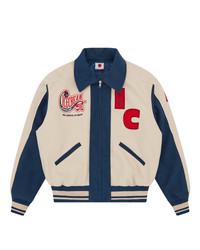 Checkout Varsity Jacket, featuring the ICECREAM convenience store logo embroidered on the right chest and the IC Stack Em Up felt patch on the other side of the chest. It presents multi ICECREAM graphics on the back. - Ecru/Blue - Relaxed fit - Convenience store direct embroidery on the right chest - IC Stack Em Up felt patch logo on the left chest - ICECREAM felt patch graphics on back - Diamond quilted lining - Zip closure - Contrasting ribbed collar, cuffs, and hem - Shell: 100% Polyester, Lining: - 100% Polyester, Filling; - 100% Polyester