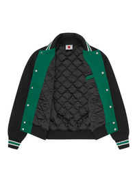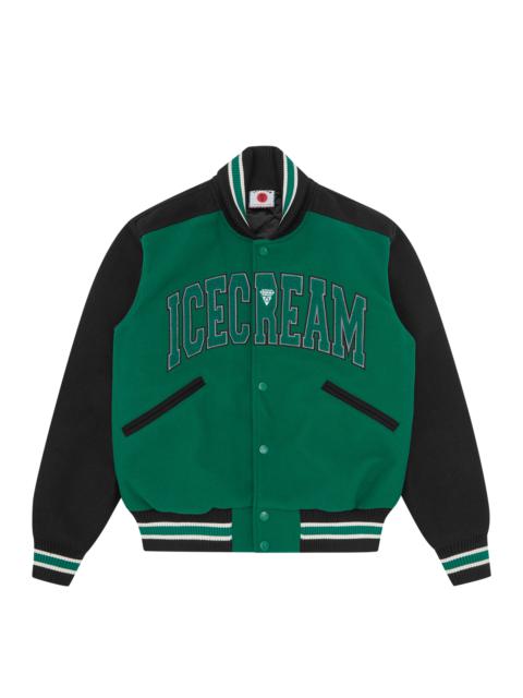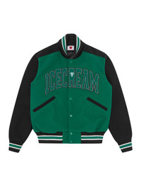 College Varsity Jacket, featuring the chenille ICECREAM patch logo at chest and it is detailed with contrasting striped collar, cuffs and hem. - Green/Black - Relaxed fit - Chenille ICECREAM patch at chest - Embroidered diamond at front - Double front pockets - Quilted lining - Popper-fasten closure - Branded buttons - Ribbed collar, cuff, and hem - 100% Polyester
