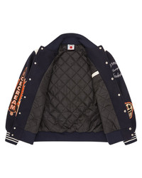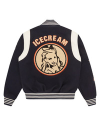 Collegiate Patch Varsity Jacket, featuring ICECREAM branded chenille patches on the front, back and on the sleeves. It presents faux leather inserts in the shoulder seams and pockets. - Navy - Regular fit - Chenille IC patch on the left chest - Chain stitched embroidery ICECREAM logo on the left chest - Chenille Running Puppy felt patch on right chest - Chenille Running dog felt patch on front body - Chenille ICECREAM felt patch lettering on the back - Chenille waitress felt patch on the back - Chenille cone felt patch on the sleeve - Direct ICECREAM Skateboard embroidery on the left sleeve - Direct ICECREAM Rocket embroidery on the right sleeve - Double front pockets - Faux leather inserts on shoulder seams and pockets - Diamond quilted lining - Branded popper-fasten closure - Branded buttons - Ribbed collar, cuffs, and hem with contrasting stripes - Shell: 100% Polyester, Lining: - 100% Polyester, Filling; - 100% Polyester