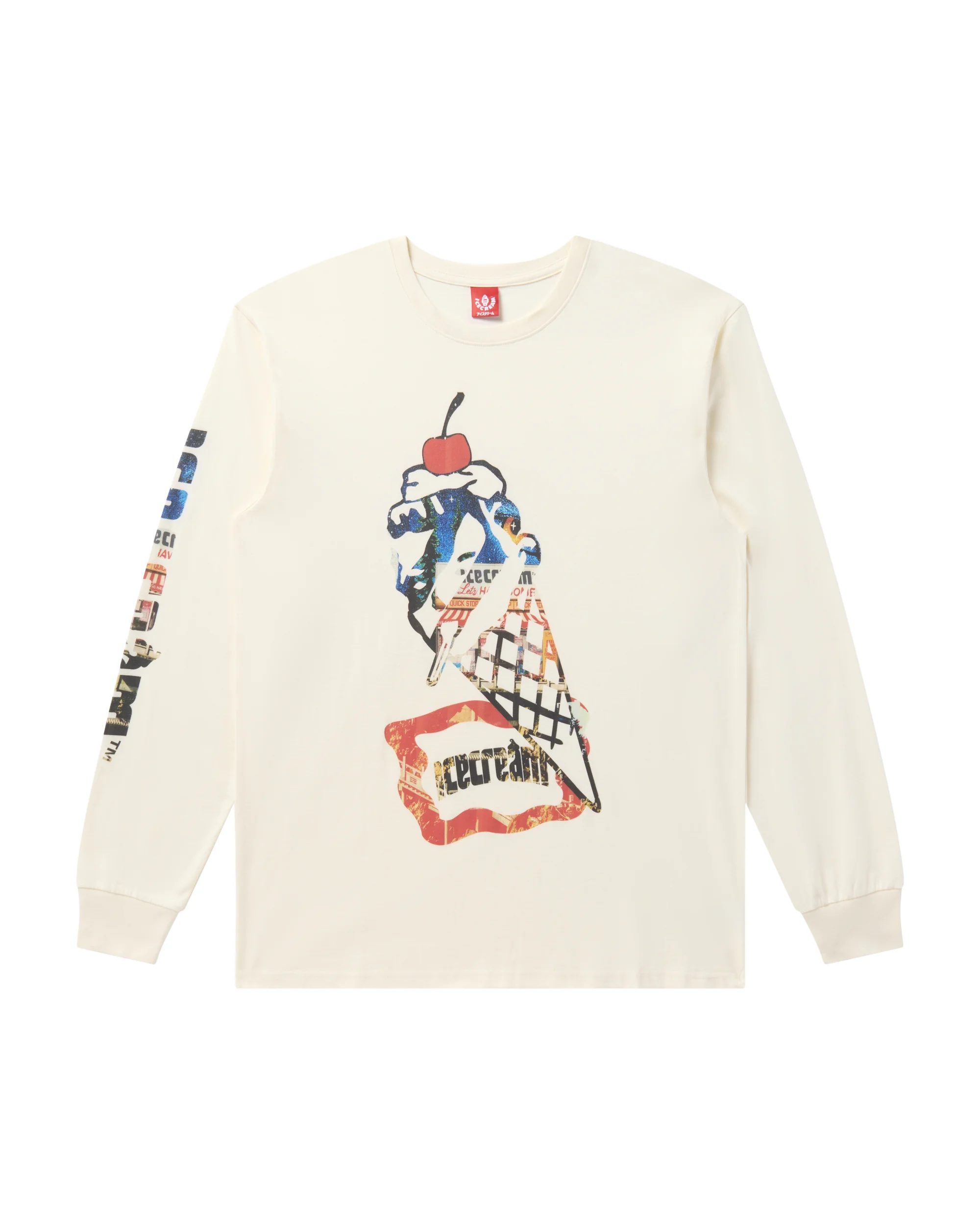 The Cone Man Longsleeve Tee features the Cone Man logo on the front, the Icecream logo on the sleeve, and the IC Signet on the back neck. - Antique White - Screen-printed graphics on the front, sleeve, and back - 100% Cotton