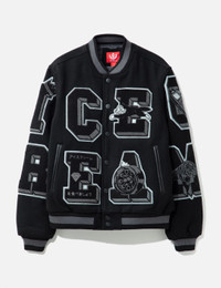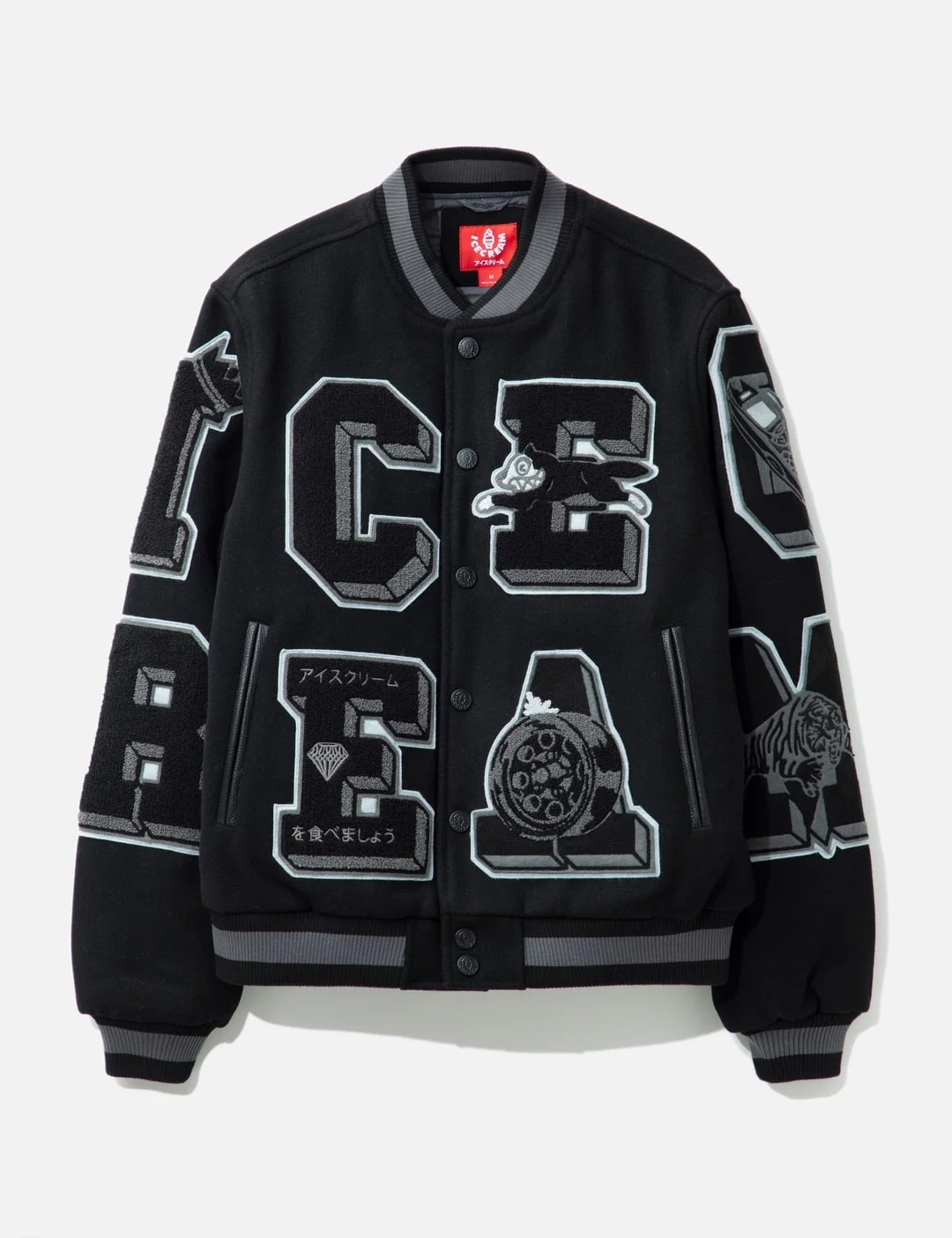 - Icecream - Creme Jacket - Wool-blend varsity jacket - Tone on tone chenille patches throughout - Ribbed collar, cuffs, and hem - Snap button closure - Two side pockets; one interior pocket - Quilted lining - Lightly padded - Color: Black - Material: 60% Wool, 40% Polyester; Lining: 100% Nylon Filling: 100% Polyester - See more Bomber Jackets, Jackets and Clothing SIZING - Model wears size M - Model measures: Height 183cm, Chest 35.5"/90cm, Waist 30"/76cm, Hip 33"/84cm