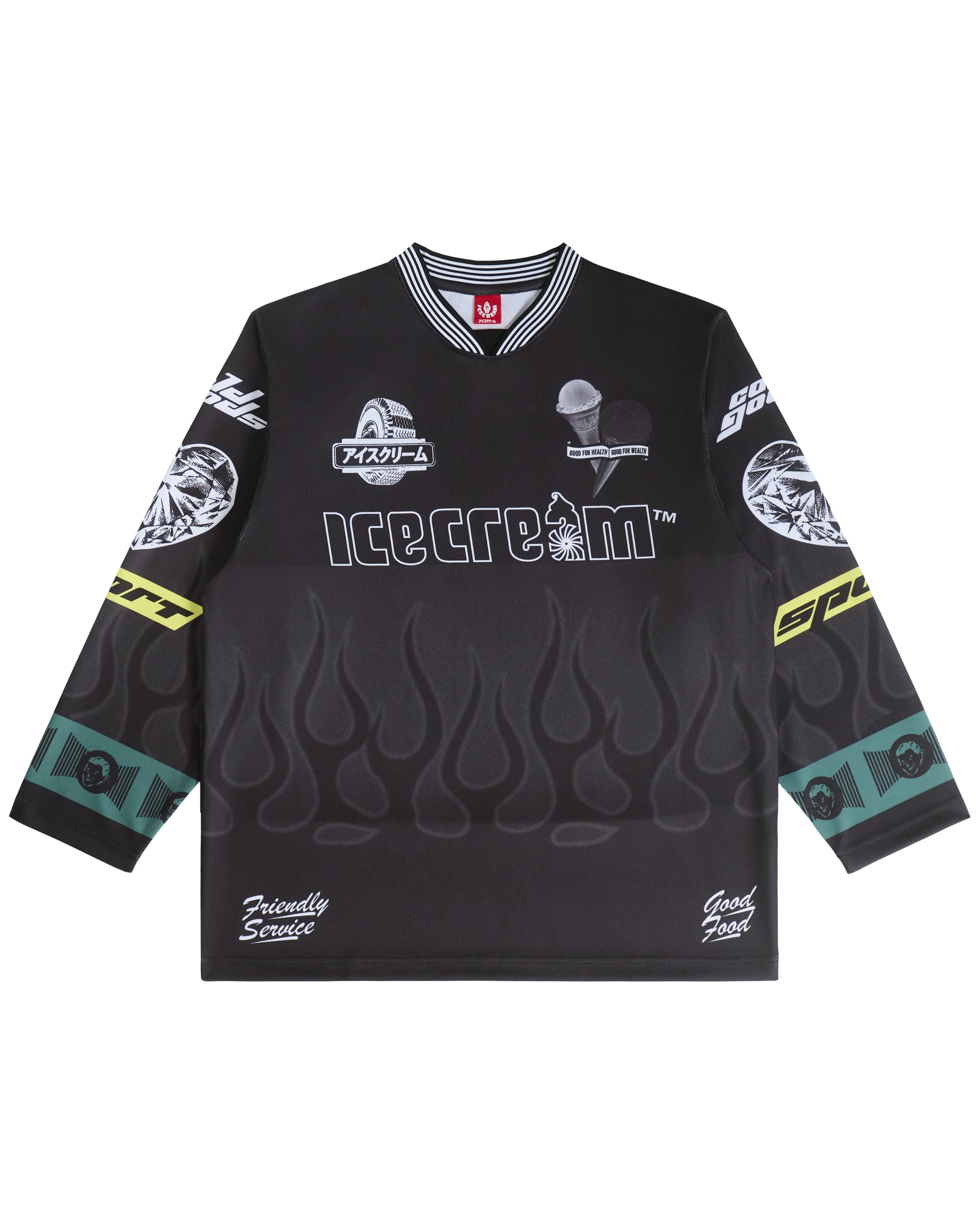The Good Food LS Jersey features bold graphics, racing typography, and signature ICECREAM branding throughout. - Black - Screen-printed graphics throughout - 100% Polyester