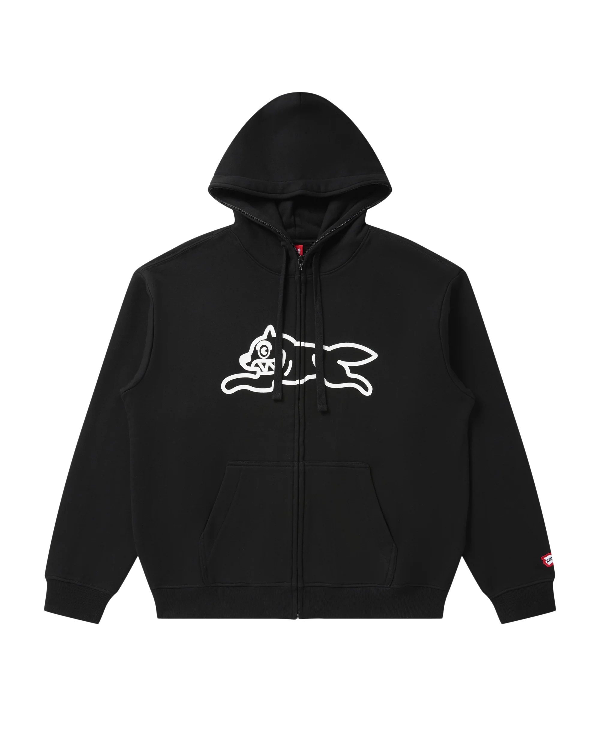 Full-zip hoodie featuring a Running Dog graphic print at front chest. - Black - Cropped, boxy fit - ICECREAM soft serve logo at sleeve - 100% Cotton French Terry