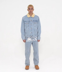 Running Dog Double Scoop Denim Pant, features a screen-printed running dog graphic on the front, embroidered double scoop signet at coin pocket, and drip detailing on the back pockets. - Heavy Wash Blue - Relaxed and loose, straight leg fit - Screen print Running Dog graphic at front - Drip embroidery on back pockets - Zip-fastened - 100% Cotton