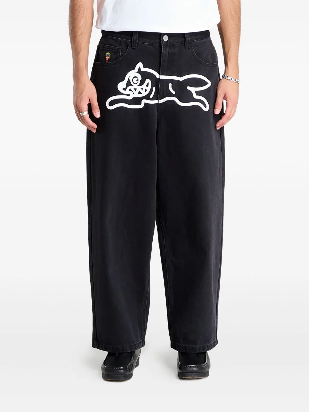 running dog jeans Highlights - Black - Running dog design - Five pockets - Belt loops - Rear logo patch - Button and zip fastening Imported Composition Cotton 74%, Polyester 26% Washing instructions Read Manufacturer Guidelines