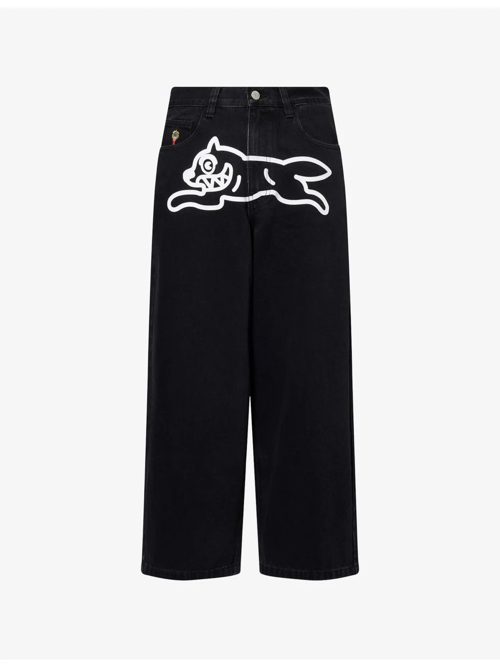 PRODUCT DETAILS - ICECREAM denim-blend jeans - 74% cotton, 26% polyester - Exposed button and concealed zip-fly fastening at front - Relaxed fit, high-rise, wide leg, belt loops, five pockets, dog print at front, brand patch at back - Machine wash at 30°C - Size UK 30: rise 15in / 38cm, inside leg 27in / 69cm, leg opening 18in / 46cm - Model is 6ft 2in/1.88m and wears a size UK 30 - Midweight, slight stretch Ref: R04507667