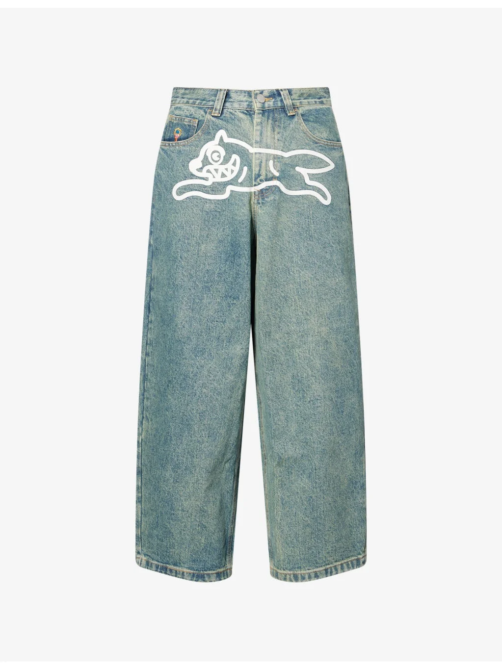 PRODUCT DETAILS - ICECREAM denim jeans - 100% cotton - Exposed button and concealed zip-fly fastening at front - Relaxed fit, high-rise, wide leg, belt loops, five pockets, dog print and ice-cream embroidery at front, brand patch at back, faded wash - Machine wash at 30°C - Size UK 30: rise 15in / 39cm, inside leg 27in / 69cm, leg opening 20in / 51cm - Model is 6ft 2in/1.88m and wears a size UK 30 - Midweight, slight stretch Ref: R04459893