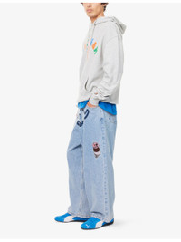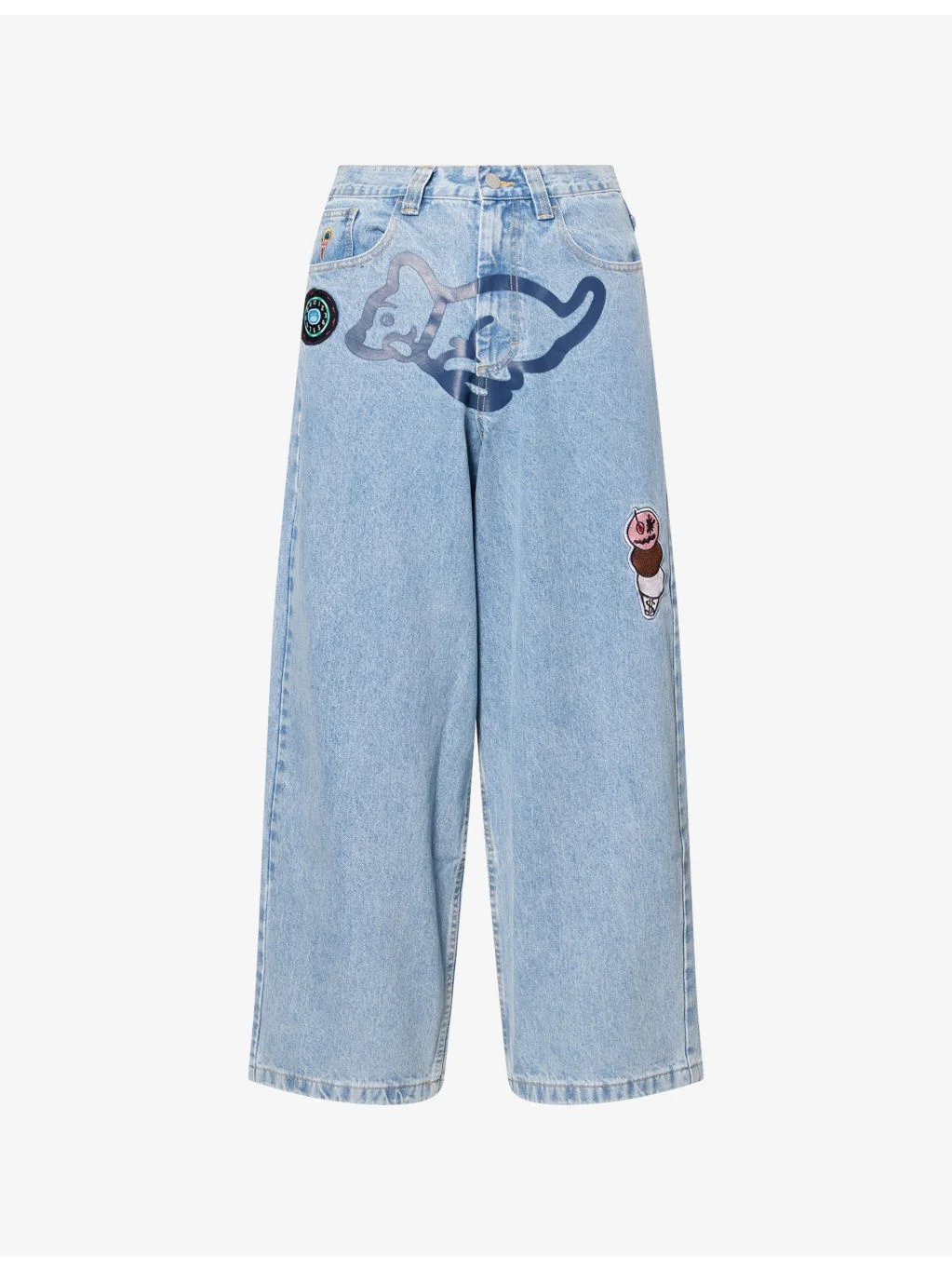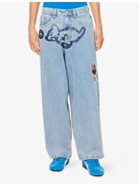 PRODUCT DETAILS - ICECREAM denim jeans - 100% cotton - Exposed button and concealed zip-fly fastening at front - Relaxed fit, high-rise, wide leg, belt loops, five pockets, ice-cream embroidery and puppy print at front, patches at back, faded wash - Machine wash at 30°C - Size UK 30: rise 15in / 39cm, inside leg 27in / 70cm, leg opening 18in / 47cm - Model is 6ft 2in/1.88m and wears a size UK 30 - Midweight, slight stretch Ref: R04459895